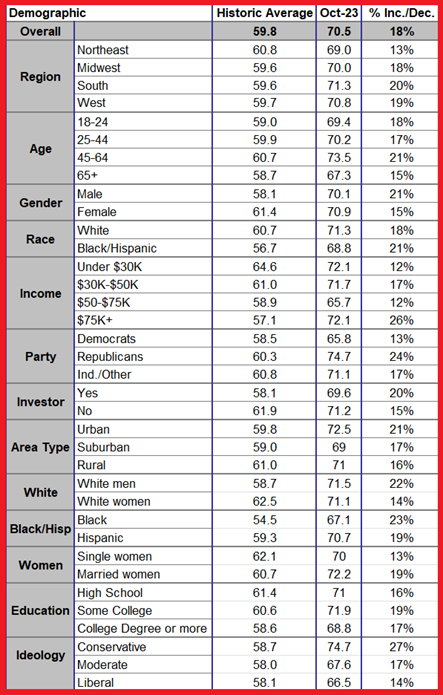 The table below displays historical averages of the index, October readings, and the percentage increase or decrease for 36 demographic groups. All 36 demographic groups exhibit stress levels above the neutral level of 50.0. Out of these 36 demographic categories, 27 (75%) are experiencing stress levels that are 15% higher than their historical averages.