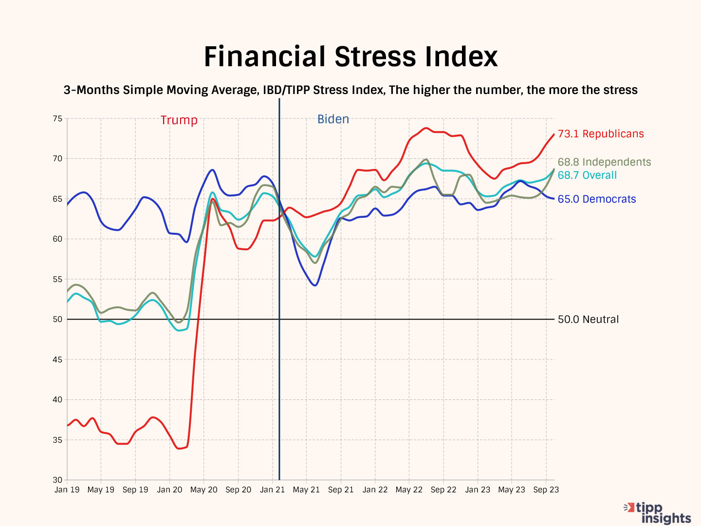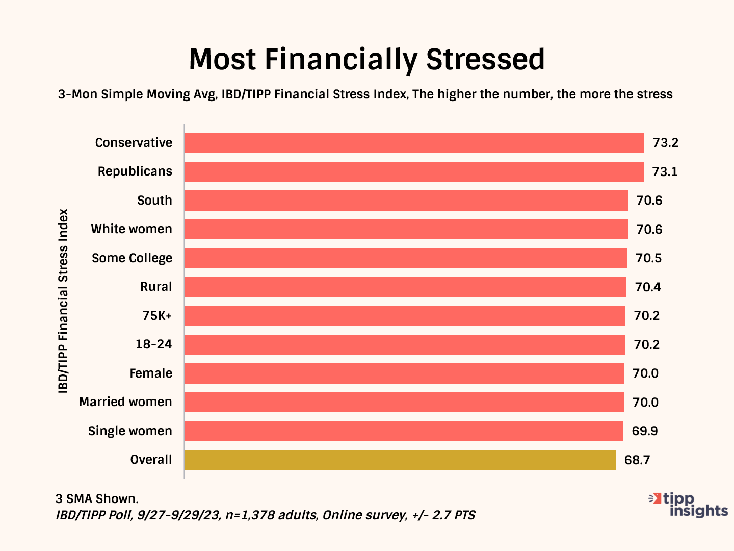 Multiple factors are intensifying stress. We enumerated them in a recent editorial. To summarize, Bidenflation, as measured by the TIPP CPI, is 16.7%, leading to higher costs for Americans and increased financial stress. Many struggle to make ends meet as wages lag behind inflation, with six in ten Americans living paycheck to paycheck. Gasoline prices surpassing $3.50 per gallon further strain finances, while the return of student loan payments and concerns about government spending contribute to economic uncertainties. Additionally, the Fed's rate hikes and the ongoing Russia-Ukraine conflict compound fears of a recession, with widespread disapproval of President Biden's handling of the economy, even among Democrats.
