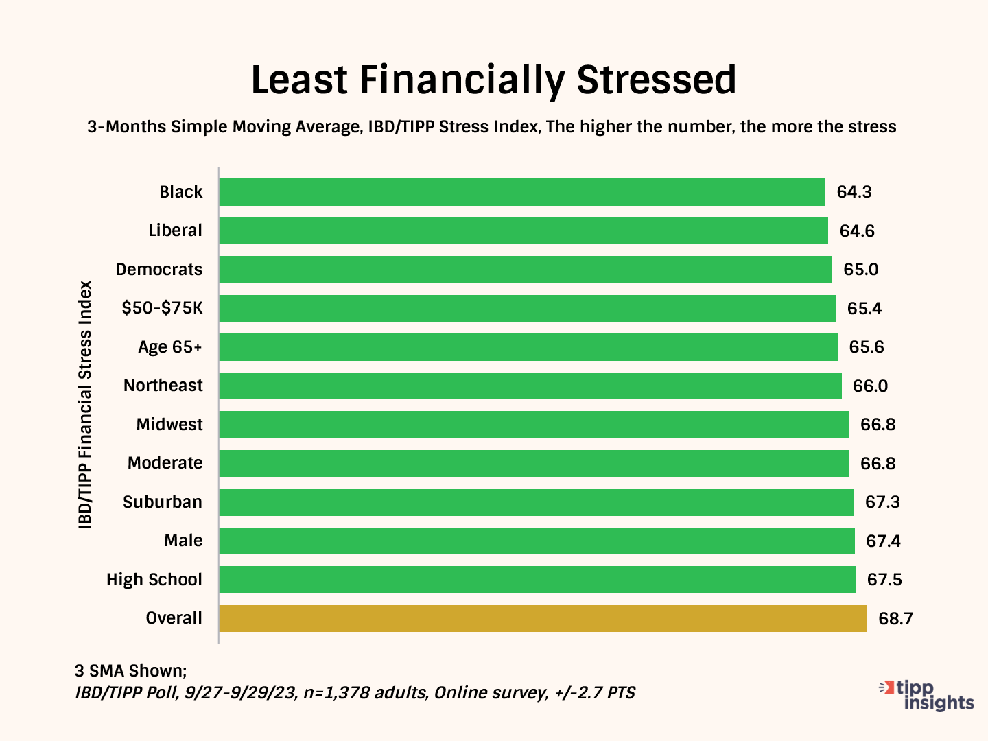 The chart below shows the eleven demographic groups with the least stress. The least stressed groups are Blacks, liberals, Democrats, those in the $50K–$75K income bracket, and those aged 65+.