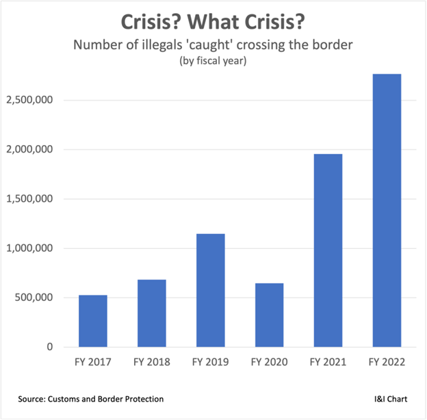 DHS’s Customs and Border Protection agency finally, after basically being forced into it, reported that it had “encountered” almost 2.8 million illegal border crossers in the past fiscal year (which ended Sept. 30). That’s up from 1.9 million last fiscal year And it’s more than four times the number in President Trump’s last year in office.
