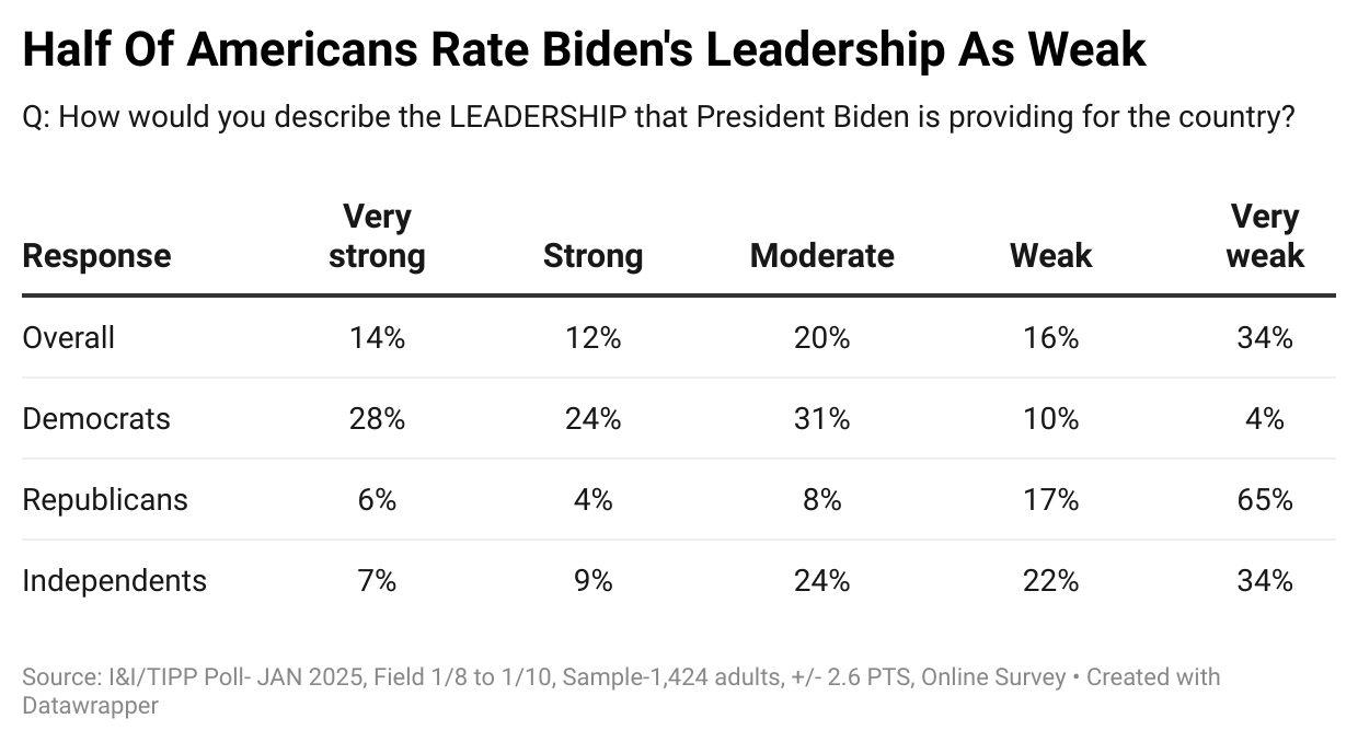 Overall, just 26% responded that Biden's leadership had either been very strong (14%) or strong (12%), while 50% called his leadership either weak (16%) or very weak (34%). Some 20% answered moderate.