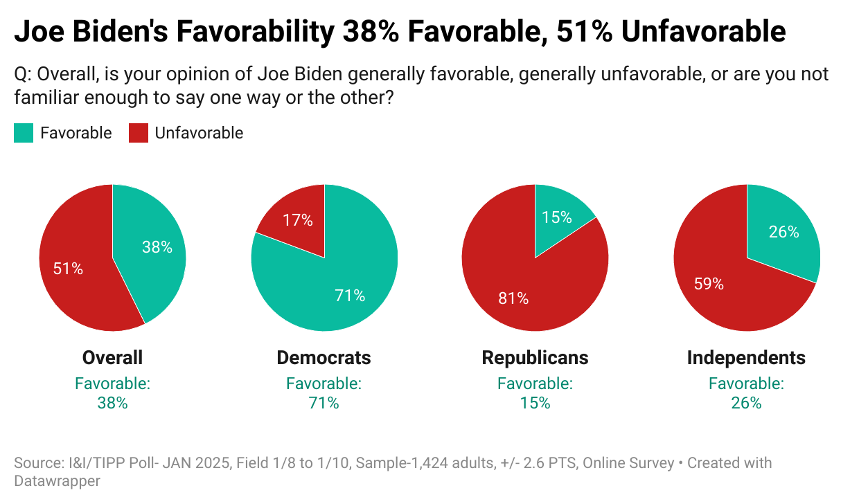 Democrats handed Biden high ratings (71% favorable, 17% unfavorable), while Republicans slammed Biden (15% favorable, 81% unfavorable) and independent voters more or less followed suit (26% favorable, 59% unfavorable).
