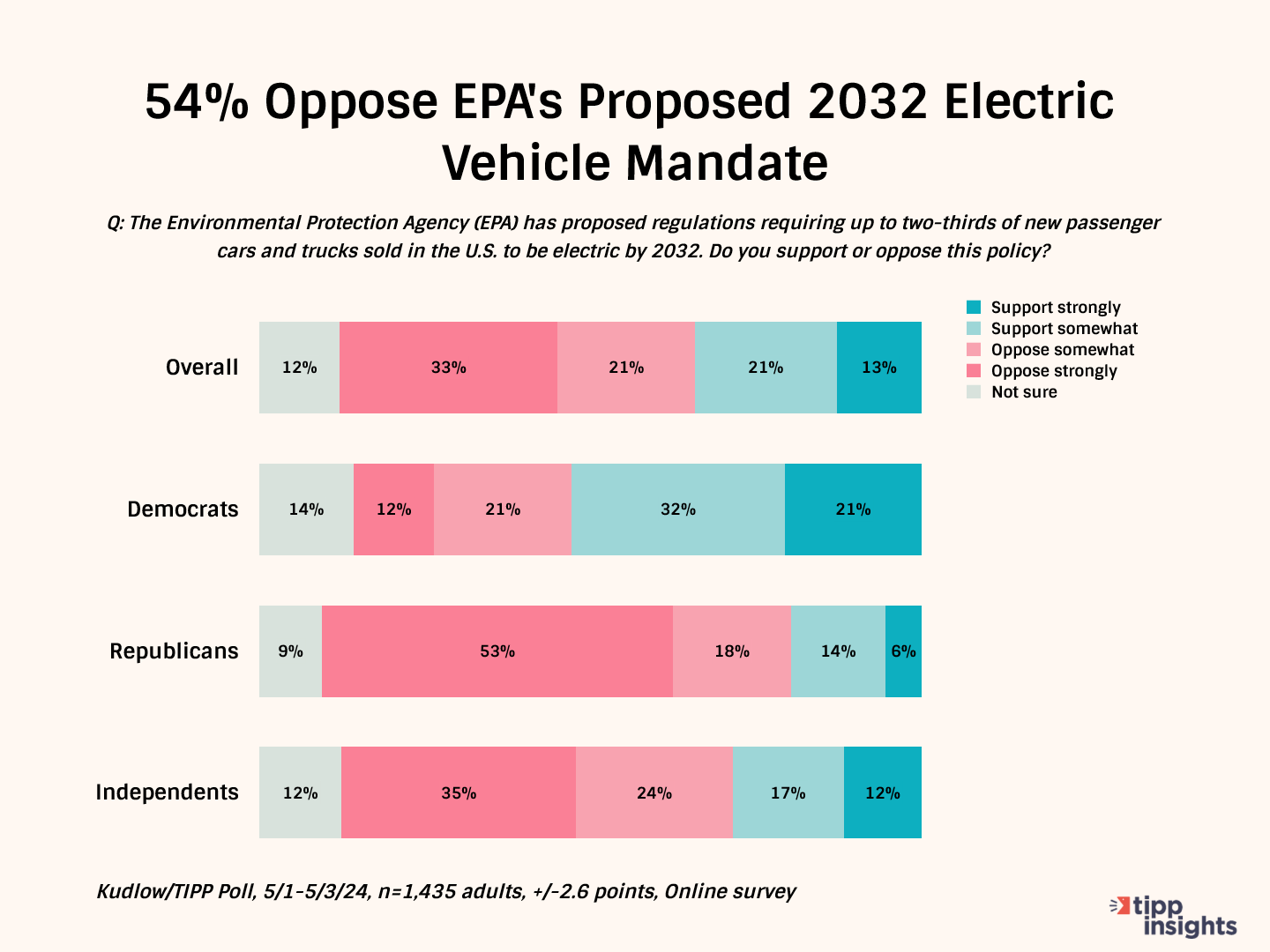 In a recently concluded nationwide Kudlow/TIPP poll of over 1400 Americans, the survey asked, “The Environmental Protection Agency (EPA) has proposed regulations requiring up to two-thirds of new passenger cars and trucks sold in the U.S. to be electric by 2032. Do you support or oppose this policy?”