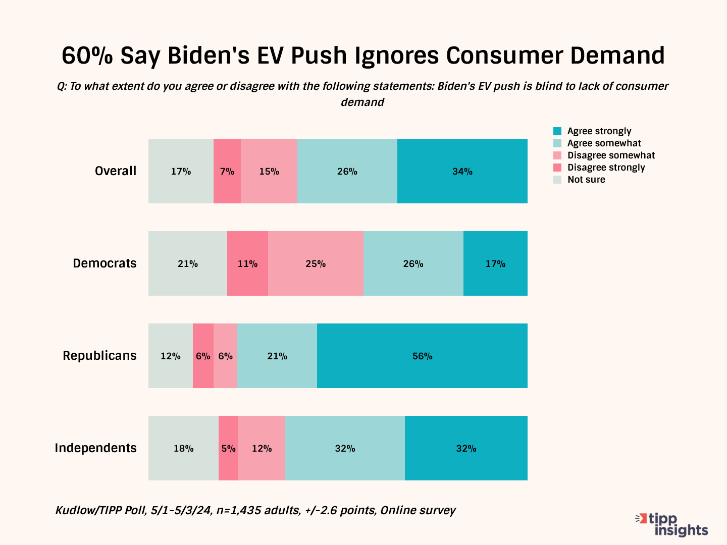 The Kudlow/TIPP Poll asked, "To what extent do you agree or disagree with the following statement: Biden's EV push is blind to a lack of consumer demand?" A clear majority, 60%, felt President Biden's focus on EVs was incongruent with falling demand. 43% of Democrats agreed with the view, as did 77% of Republicans and 64% of independents.