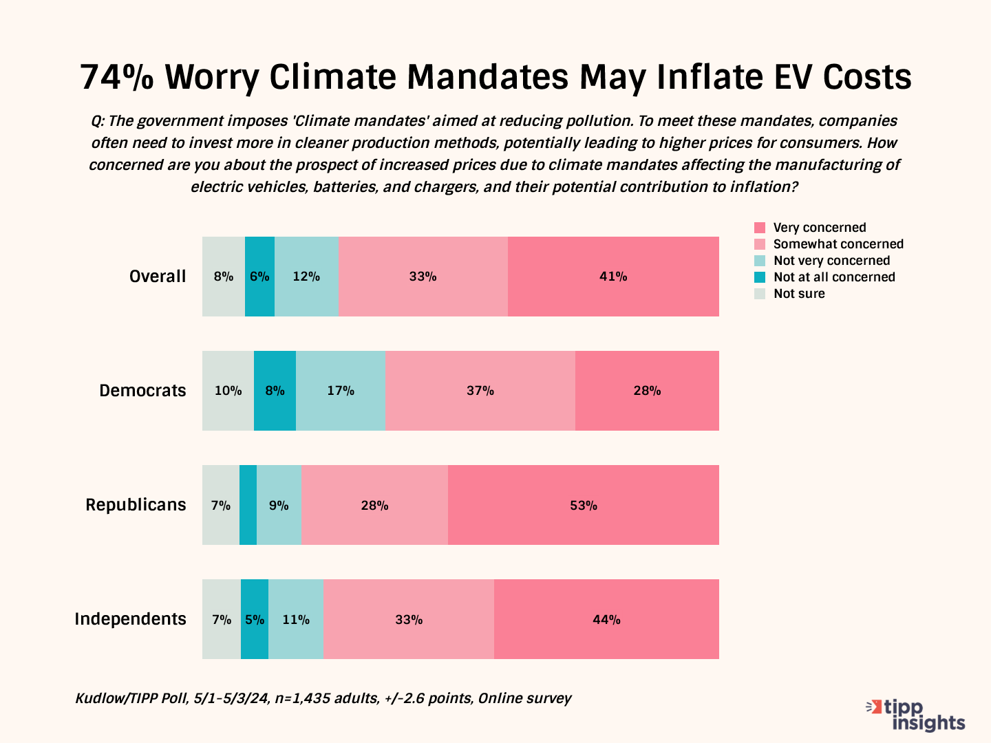 The Kudlow/TIPP Poll asked, “The government imposes 'Climate mandates' aimed at reducing pollution. How concerned are you about the prospect of increased prices due to climate mandates affecting the manufacturing of electric vehicles, batteries, and chargers and their potential contribution to inflation?”