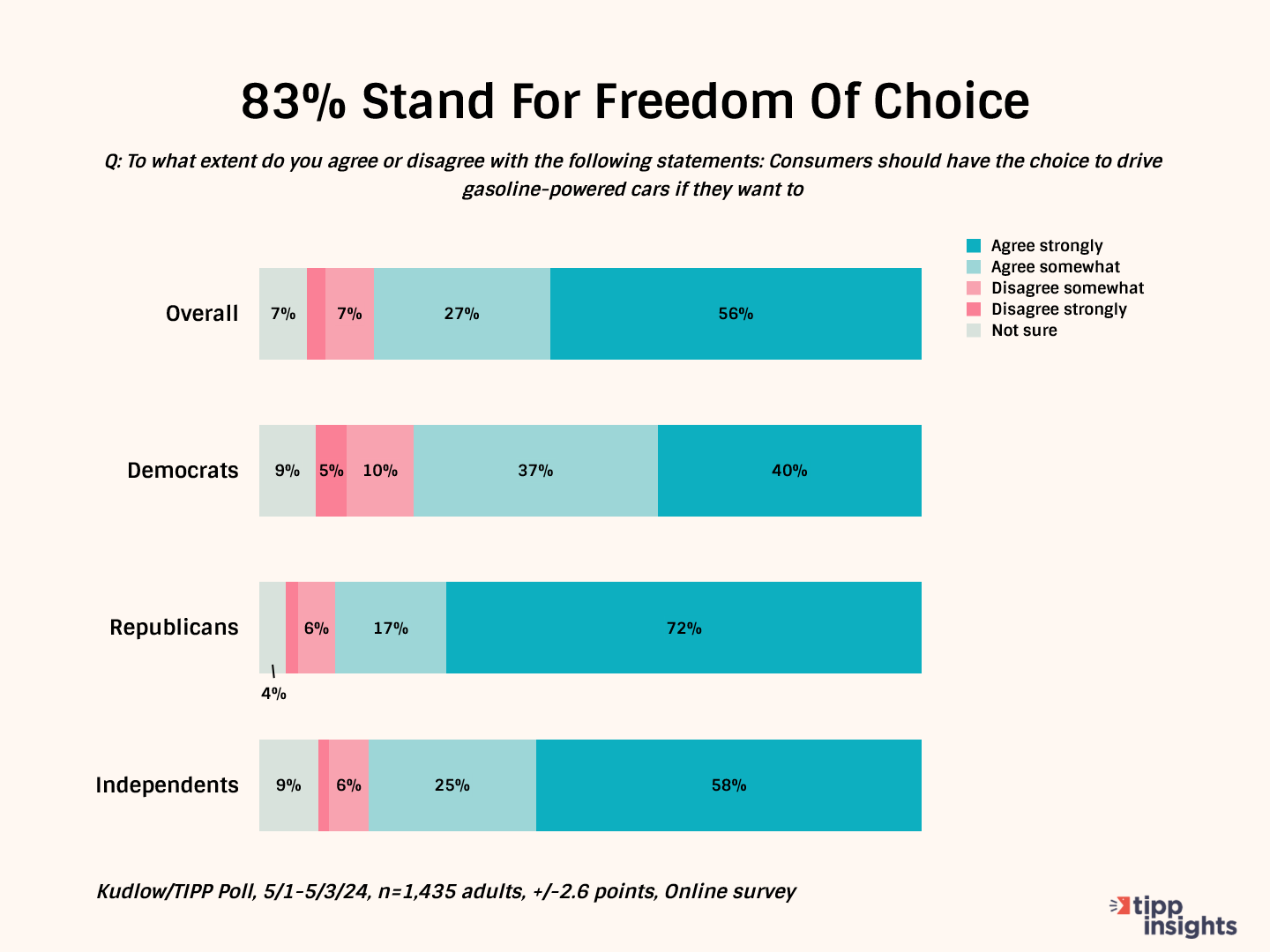 To the question, “To what extent do you agree or disagree with the following statement: Consumers should have the choice to drive gasoline-powered cars if they want to?” The survey respondents were overwhelmingly pro-choice. While 83% wanted the freedom to choose, 56% agreed strongly with the statement.