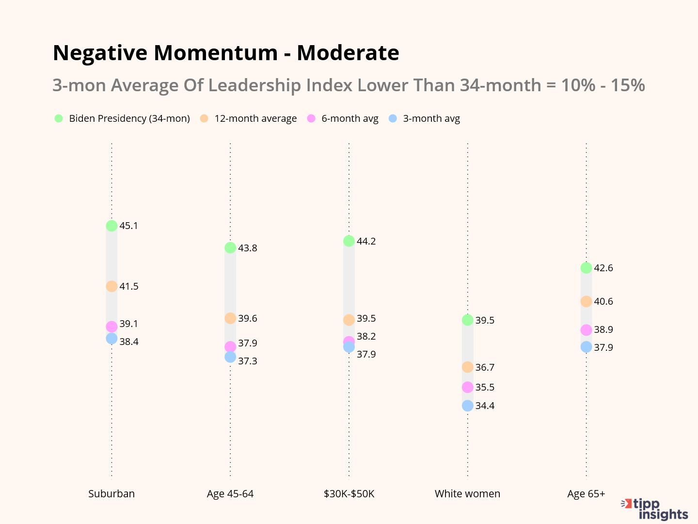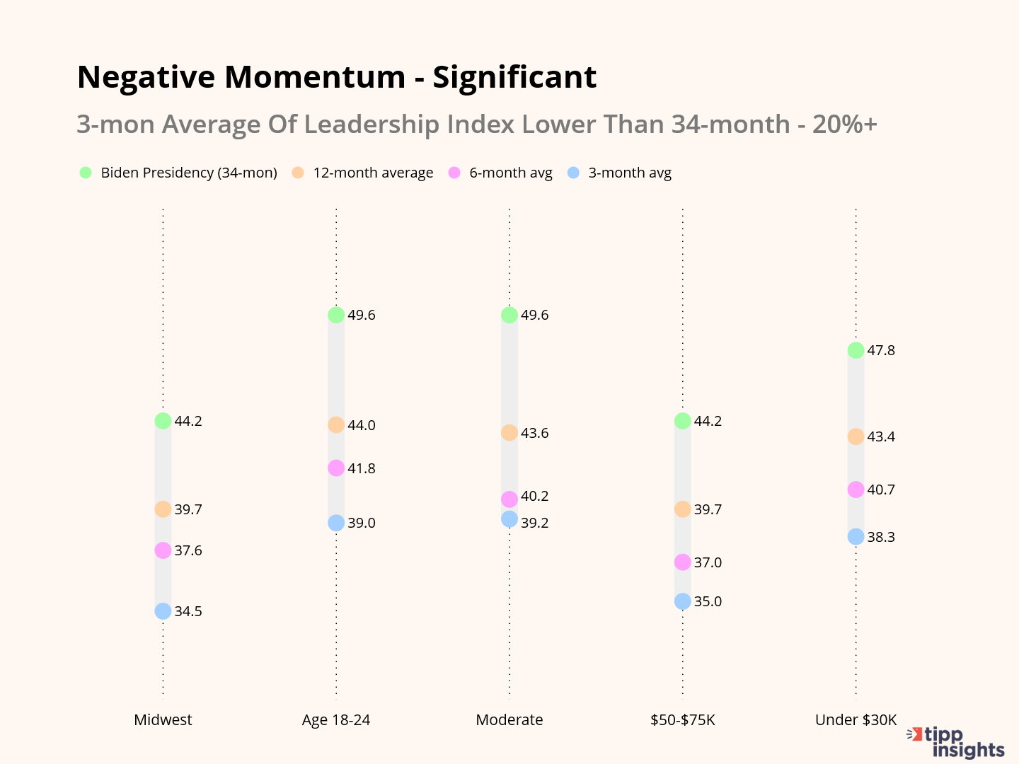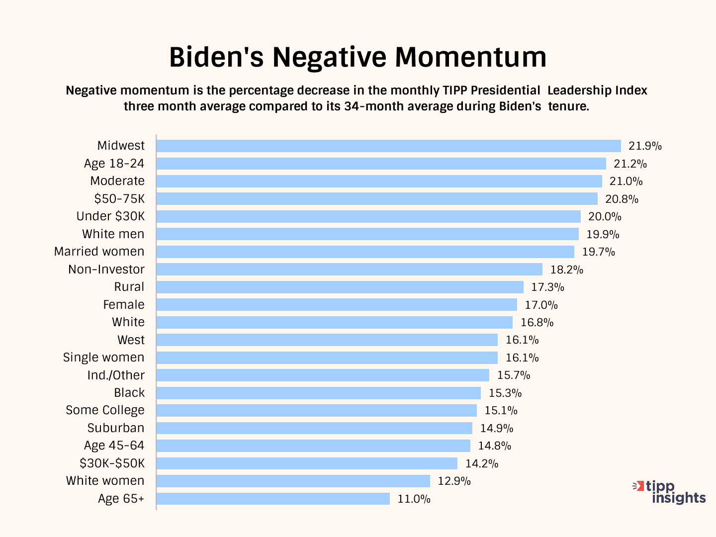 - President Biden shows significant vulnerability in five critical demographic groups based on the TIPP Presidential Leadership Index