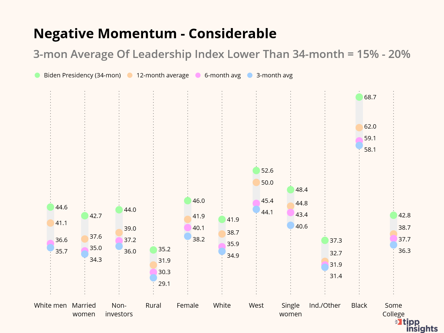 We define negative momentum as follows. First, for each demographic, we compute four averages of the Presidential Leadership Index: