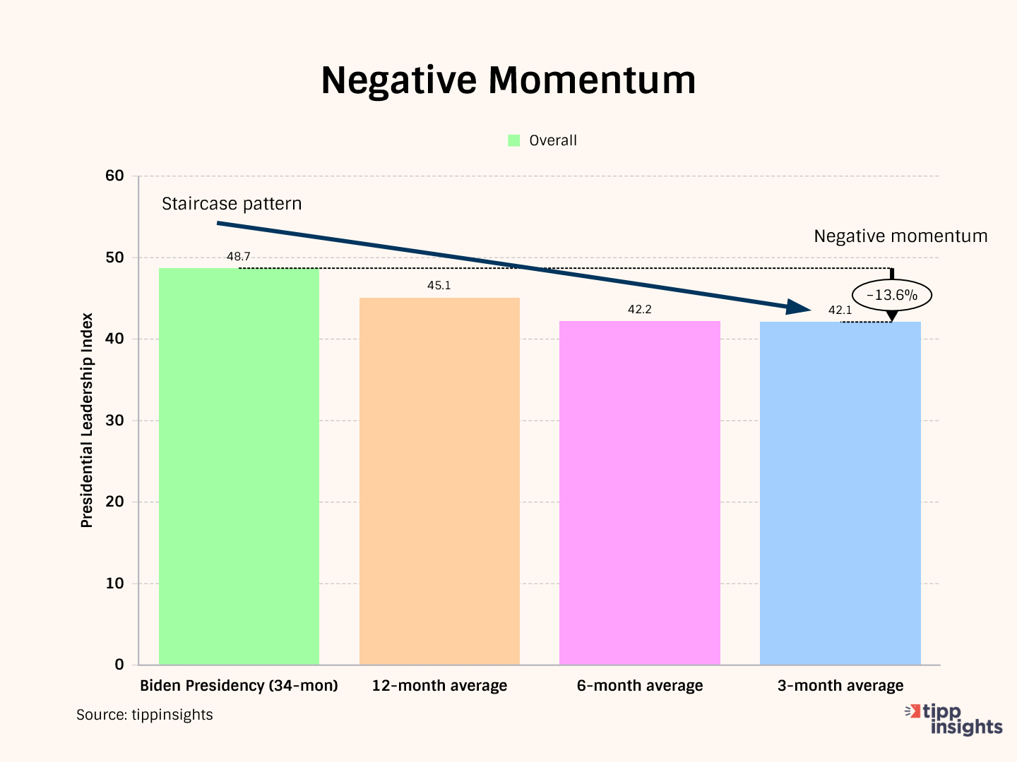 Notice that the data follows a staircase pattern. The 12-month average of 45.1 is less than the 34-month long-term average of 48.7. Furthermore, the most recent six-month average of 42.2 is lower than the 12-month average of 45.1, indicating that Americans viewed Biden’s leadership less favorably in the past six months than in the past 12 months. Additionally, his recent three-month average of 42.1 falls slightly below the six-month average of 42.2.