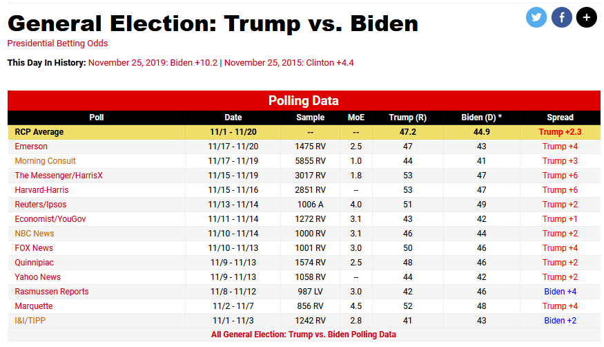In the I&I/TIPP Poll, Biden led by two points within the poll’s margin of error, as noted in the RealClearPolitics dashboard below. Notice that November 10 is a turning point. In ten polls conducted since November 10, Trump consistently leads Biden.
