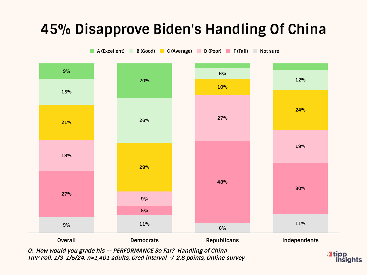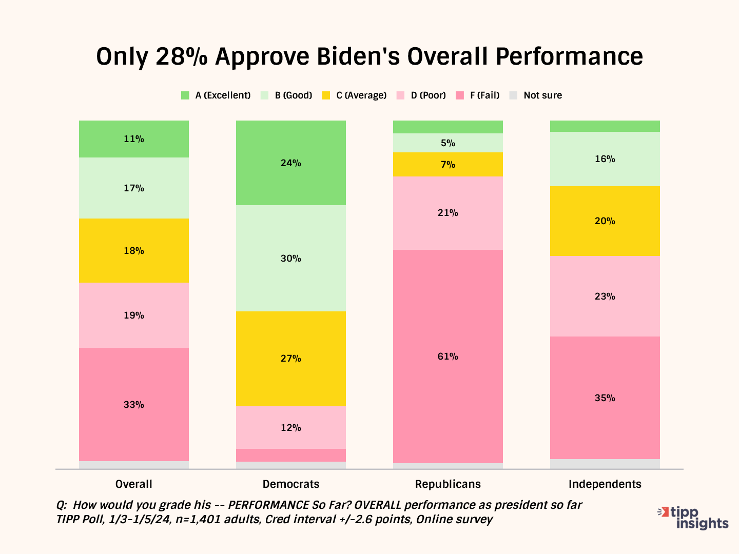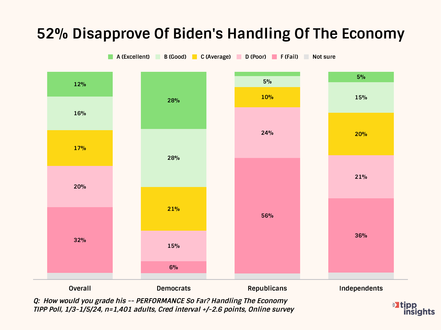 While 52% of Democrats give him good grades, Republicans (82%) and independents (56%) give him failing grades.