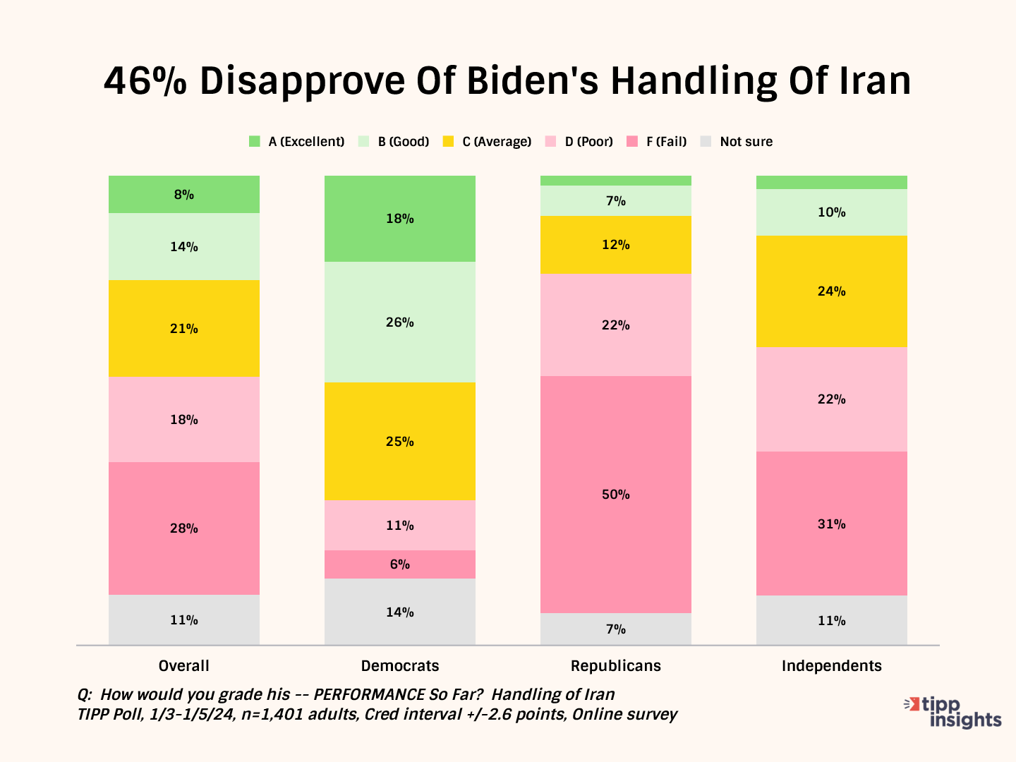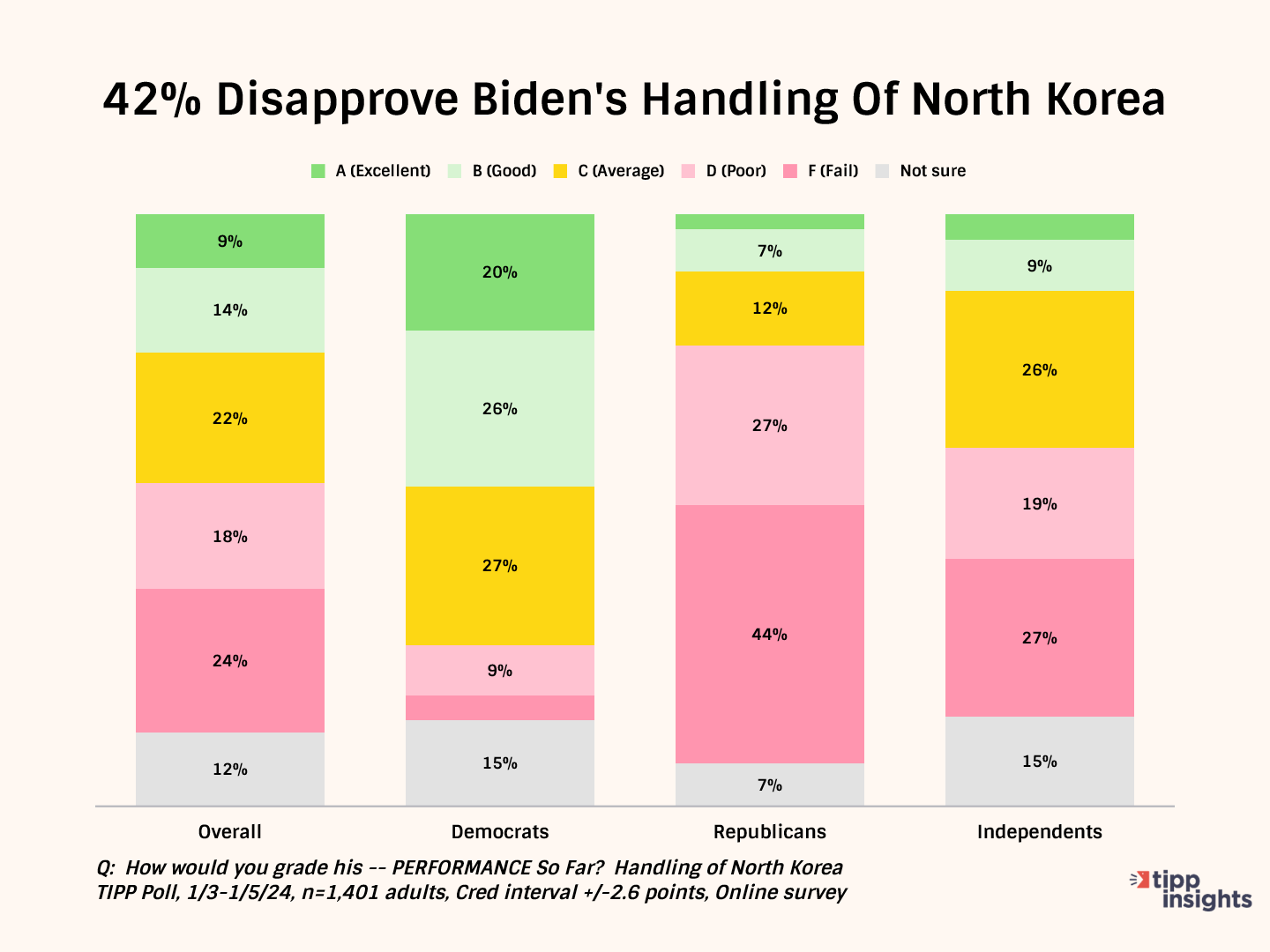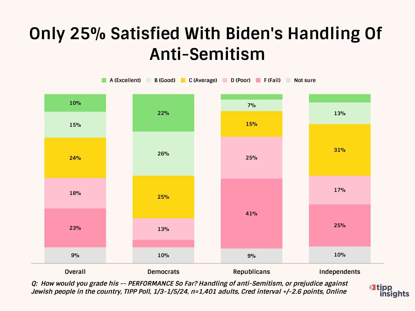While 52% of Democrats give him good grades, Republicans (82%) and independents (56%) give him failing grades.