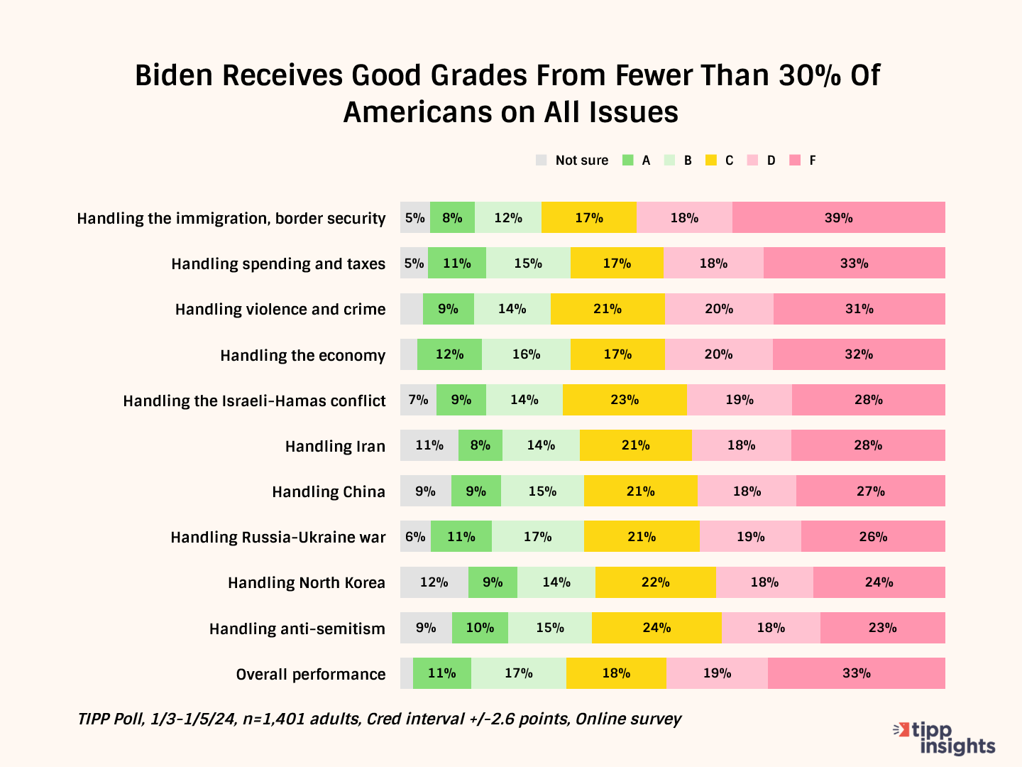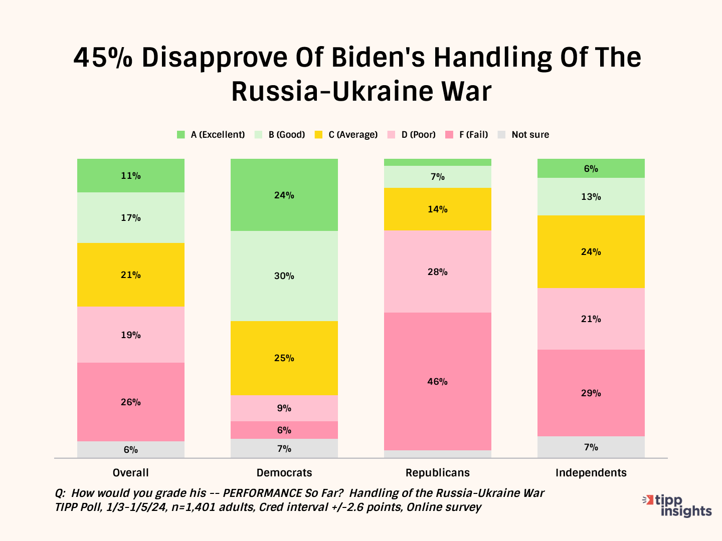 The data echoes the dissatisfaction, with 45% giving him a D or F for handling the war. Only 28% see Biden in a positive light on this issue.