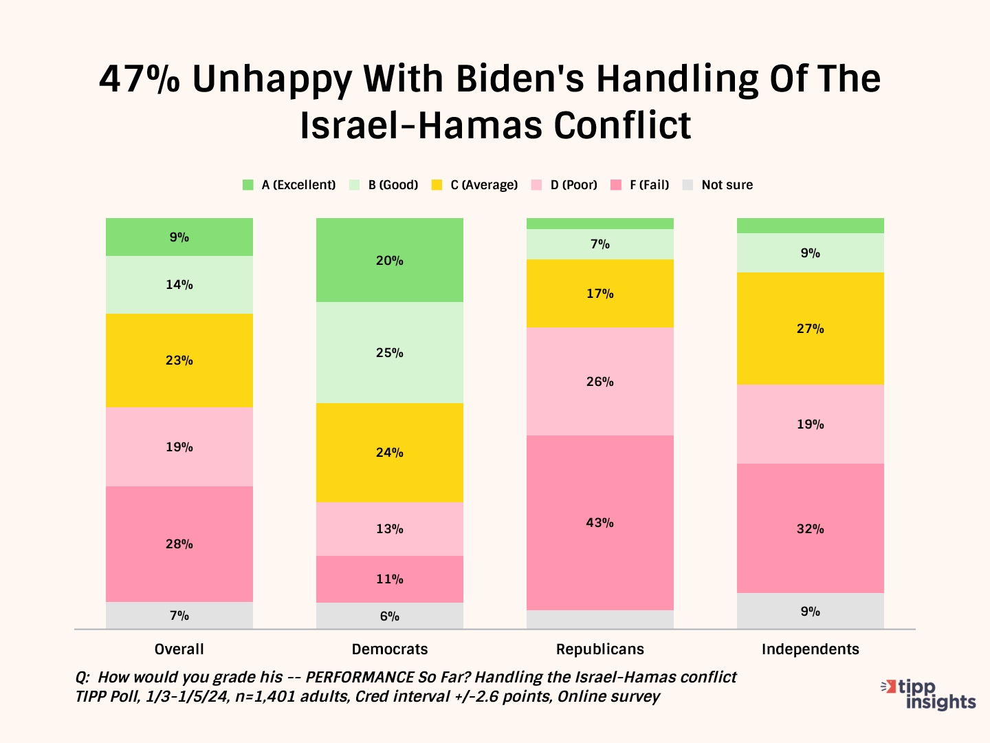 Nearly half (47%) of the poll participants are unhappy with his handling of the Israel-Hamas conflict. Just a quarter (23%) give him good grades.