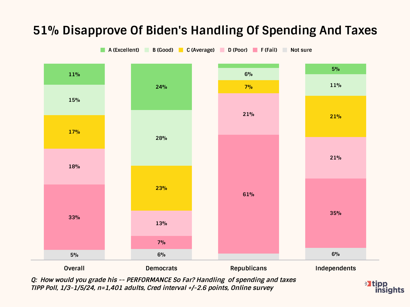 Overall, one-half (51%) give Biden a “D” or “F” for his handling of spending and taxes. Only 26% give him good grades.