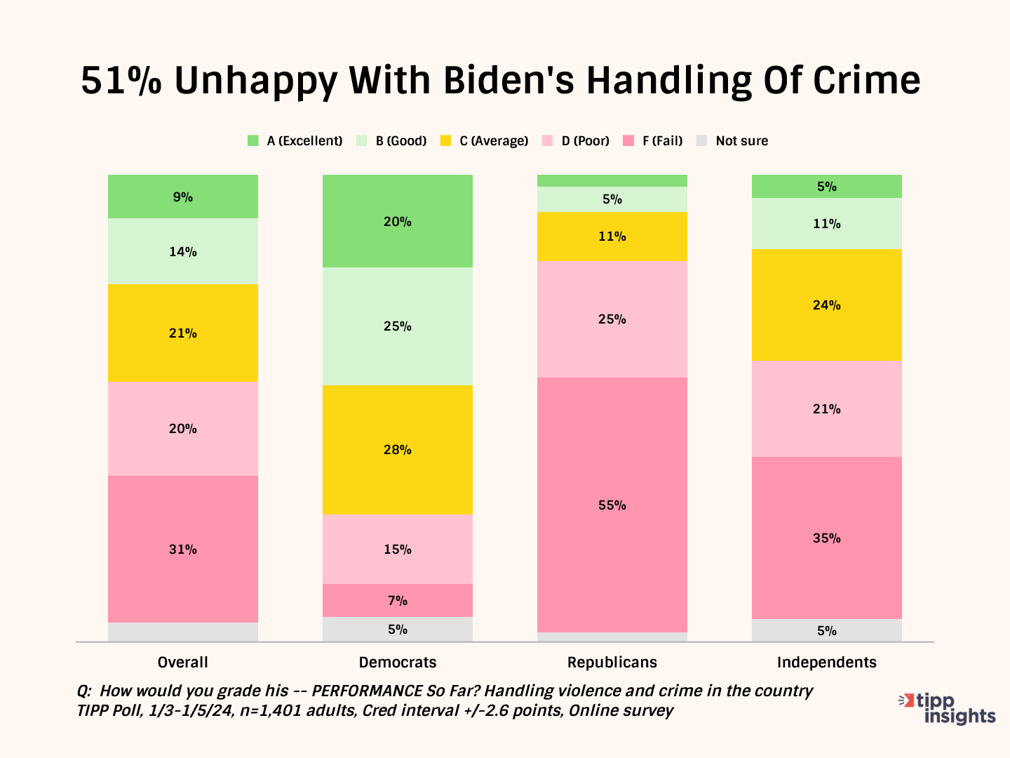 This month, over half (51%) give Biden failing grades for his handling of crime. Only 23% give him an A or B.