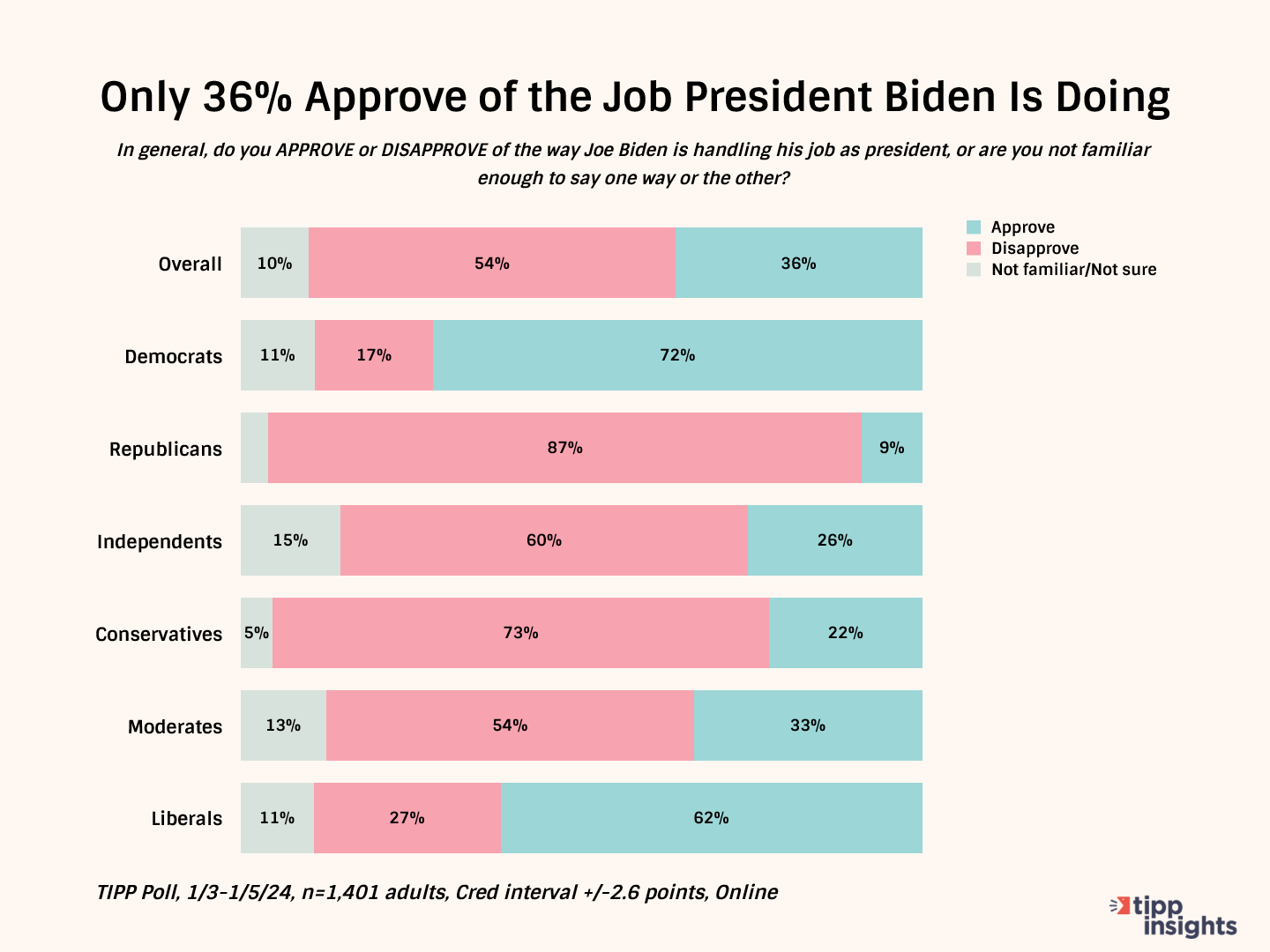 President Biden's job approval ratings improved from a 35-month low of 33% in December to 36% in early January. That is the key finding of a nationwide TIPP Poll conducted among 1,401 adults and completed on Friday. The poll has a credibility interval of +/- 2.6 percentage points.