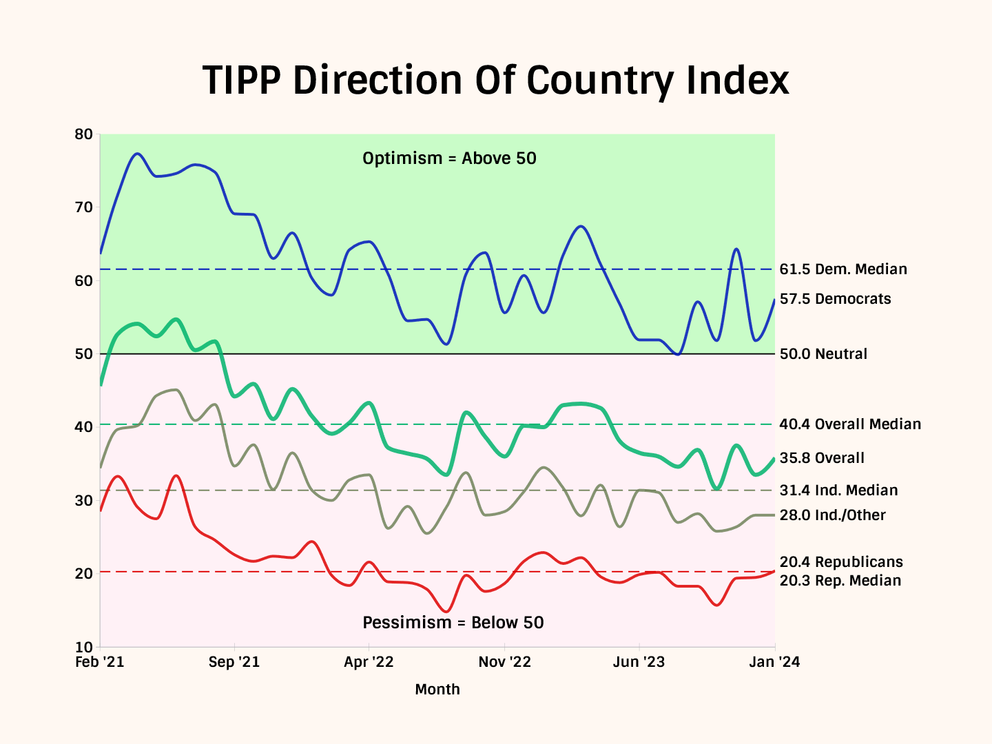 The overall index has been in the pessimistic region since August 2021. In January, Republicans (22.6) and independents (30.8) are pessimistic, while Democrats are barely optimistic at 57.2.