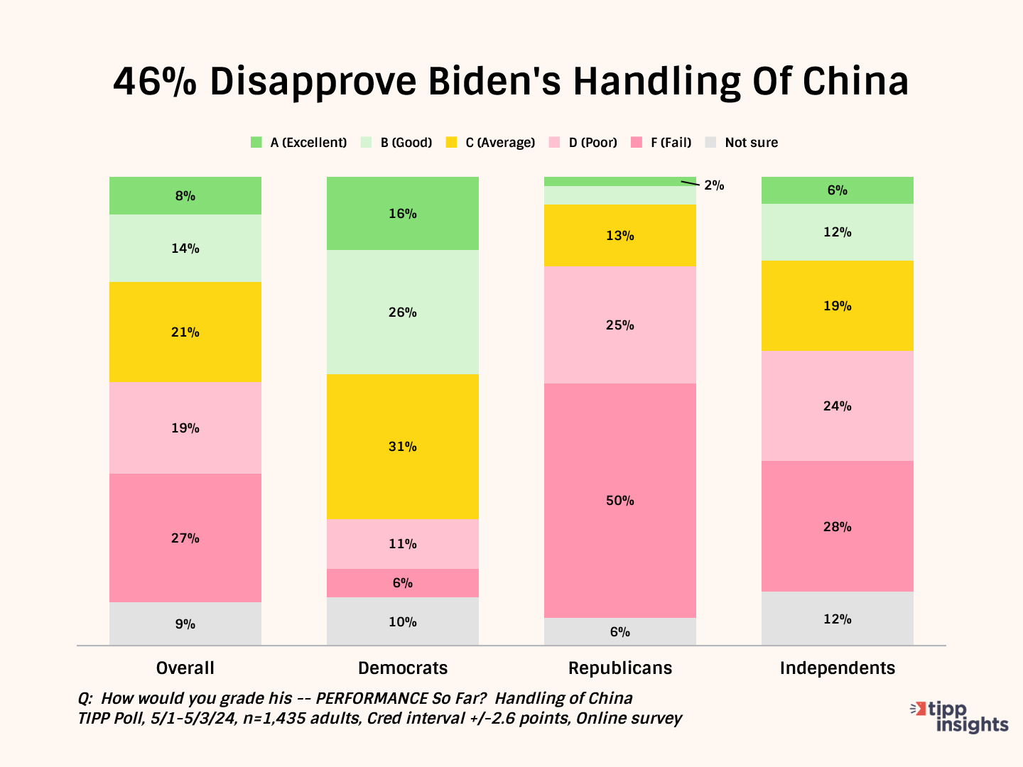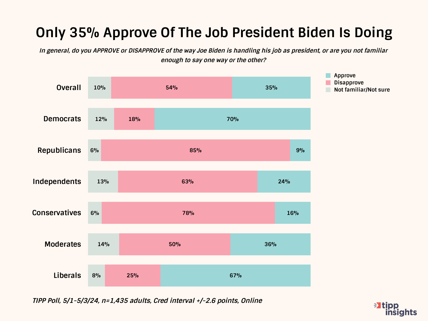 The results are from a nationwide TIPP Poll that surveyed 1,435 Americans from May 1 to May 3. The credibility interval for the survey is +/—2.6 percentage points.