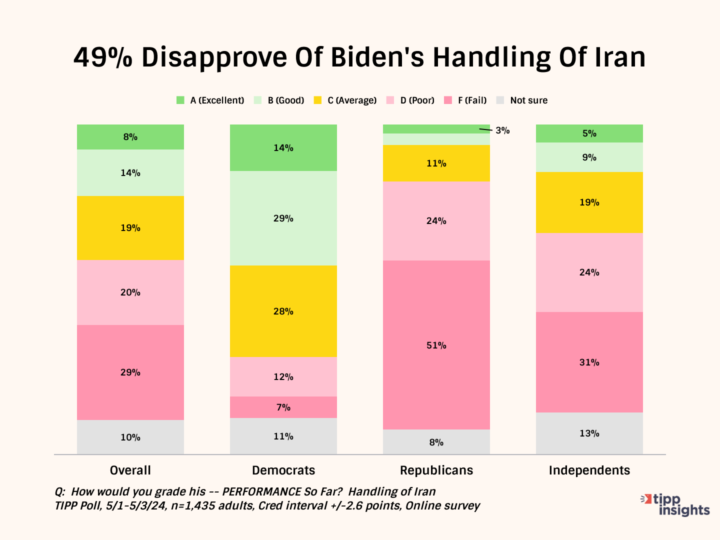 Nearly one in two (49%) gives Biden failing grades for his handling of Iran, while around one-fifth (22%) give him favorable grades.