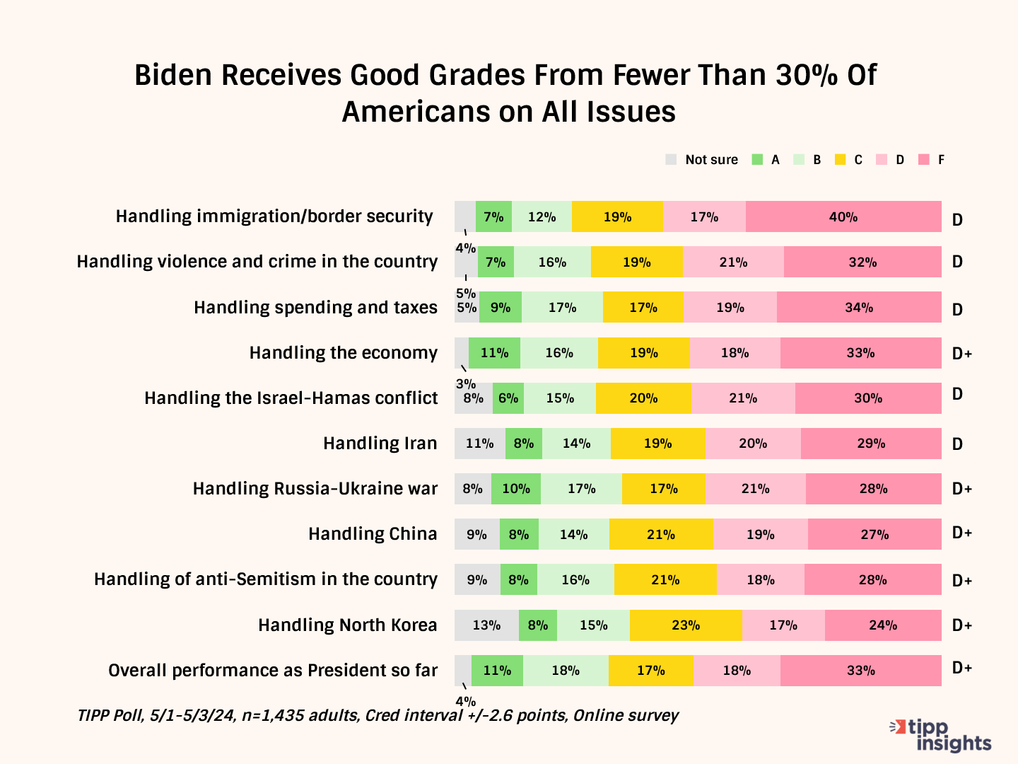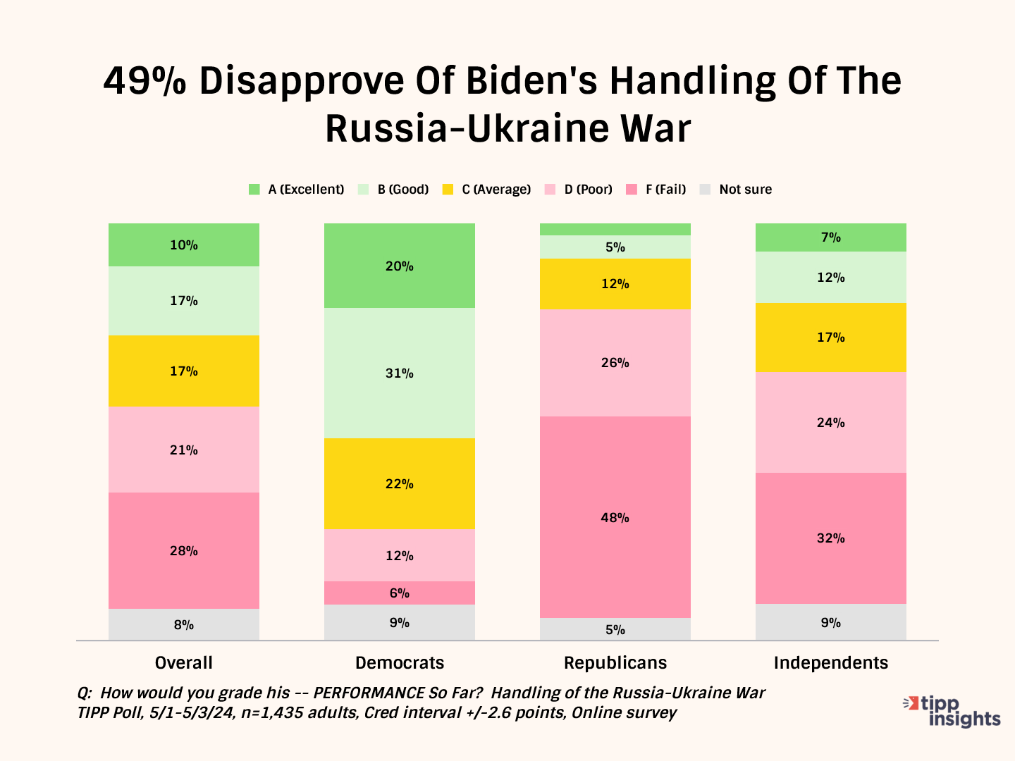The data echoes the dissatisfaction, with 49% giving him a D or F for handling the war. Only 27% see Biden in a positive light on this issue.