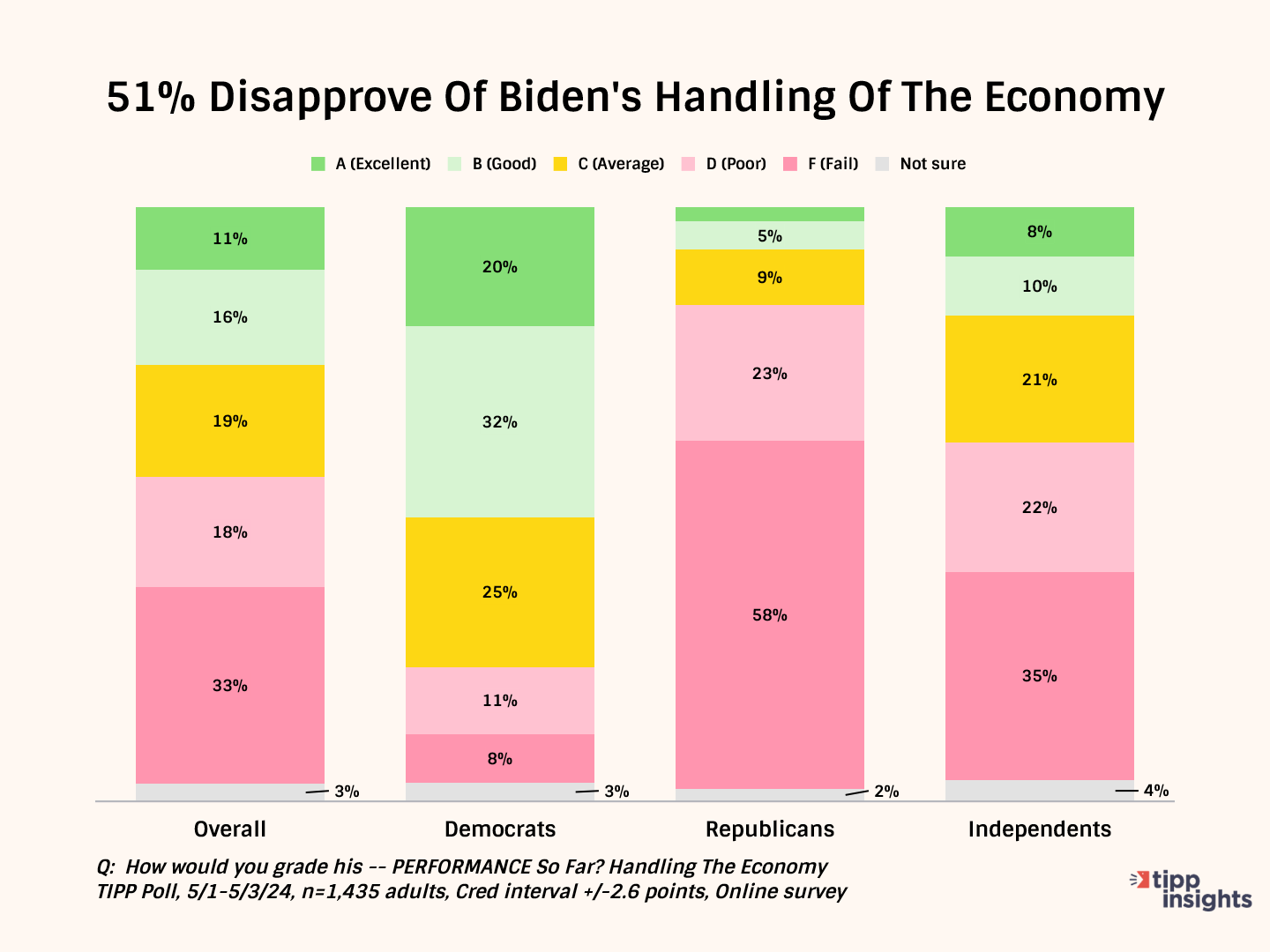 Overall, one-half (51%) give Biden a “D” or “F” for his handling of the economy. Only 27% give him good grades.