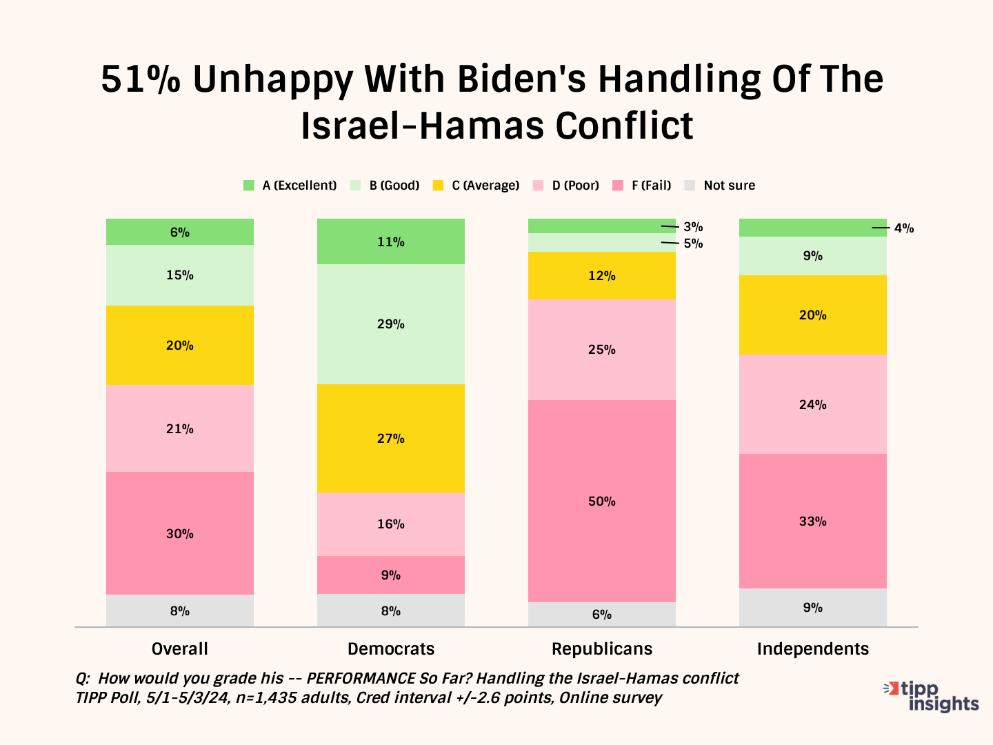 One-half (51%) of the survey participants are unhappy with Biden’s handling of the Israel-Hamas conflict. Just over one-fifth (21%) give him good grades.