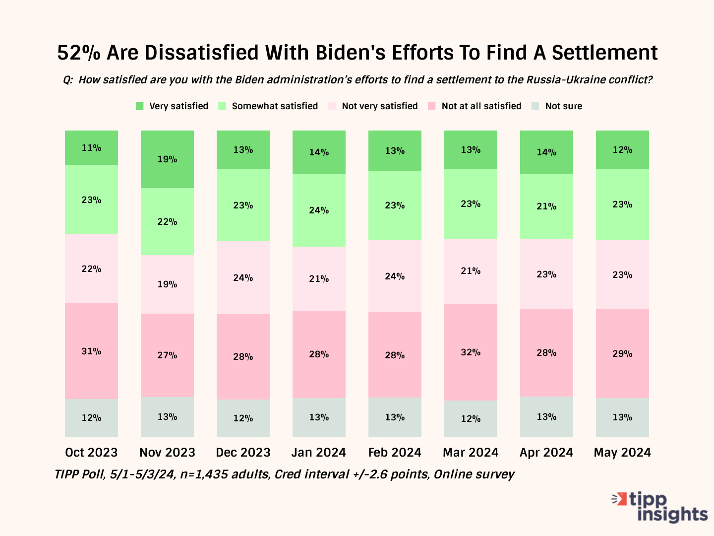 Half (52%) are dissatisfied with Biden’s efforts to find a settlement. This statistic has hovered around 50% in our tracking since October 2023.