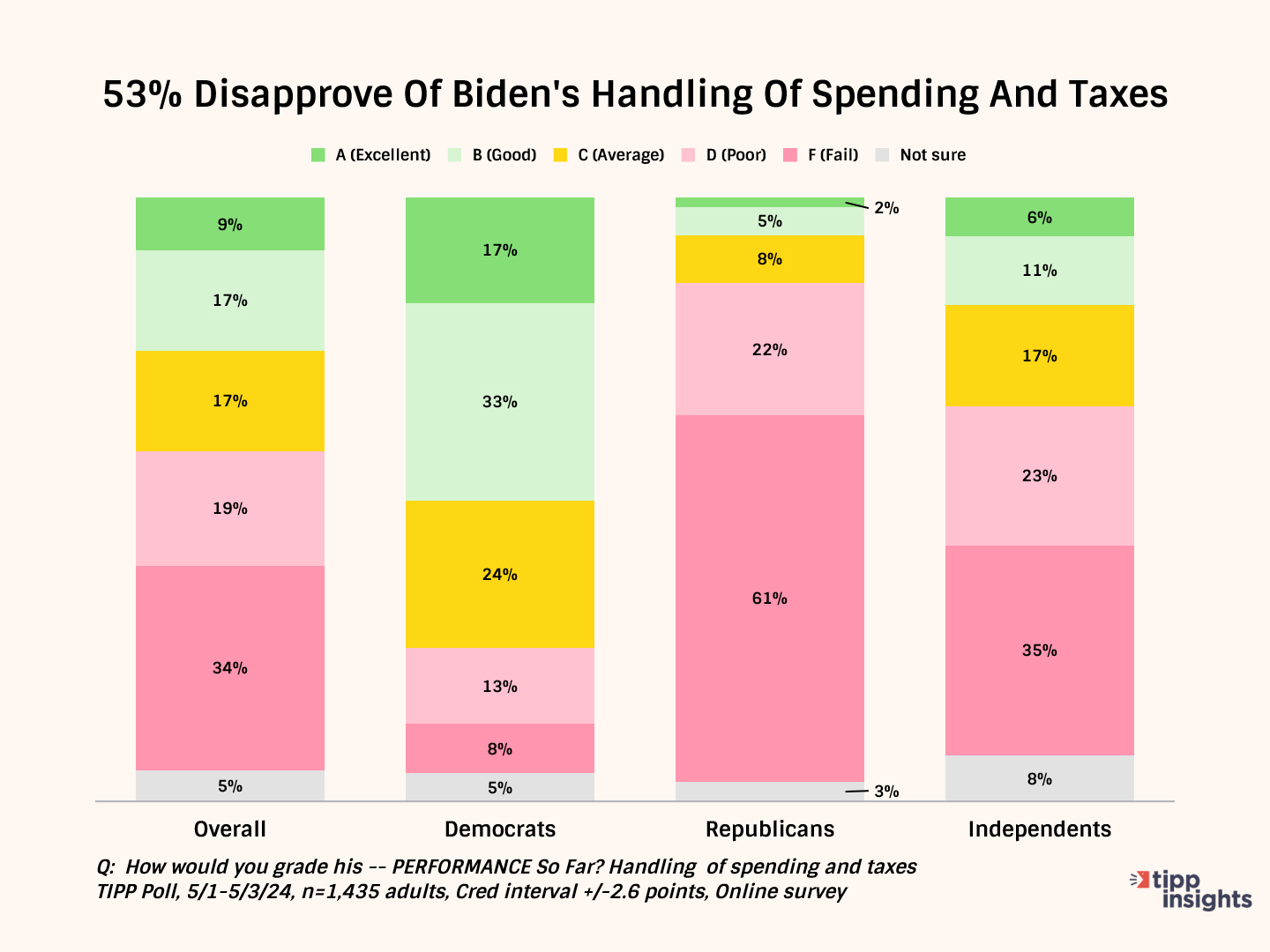 Overall, one-half (53%) gave President Biden a “D” or “F” for handling spending and taxes. Only 26% give him good grades.