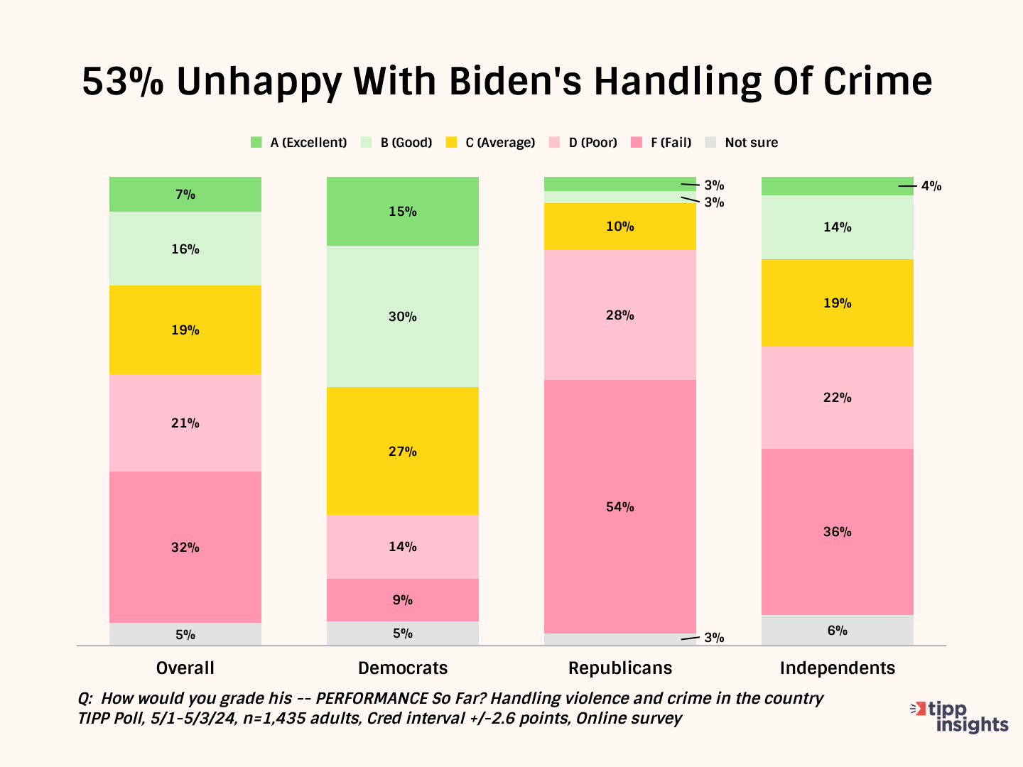 This month, over half (53%) give Biden failing grades for his handling of crime. Only 23% give him an A or B.