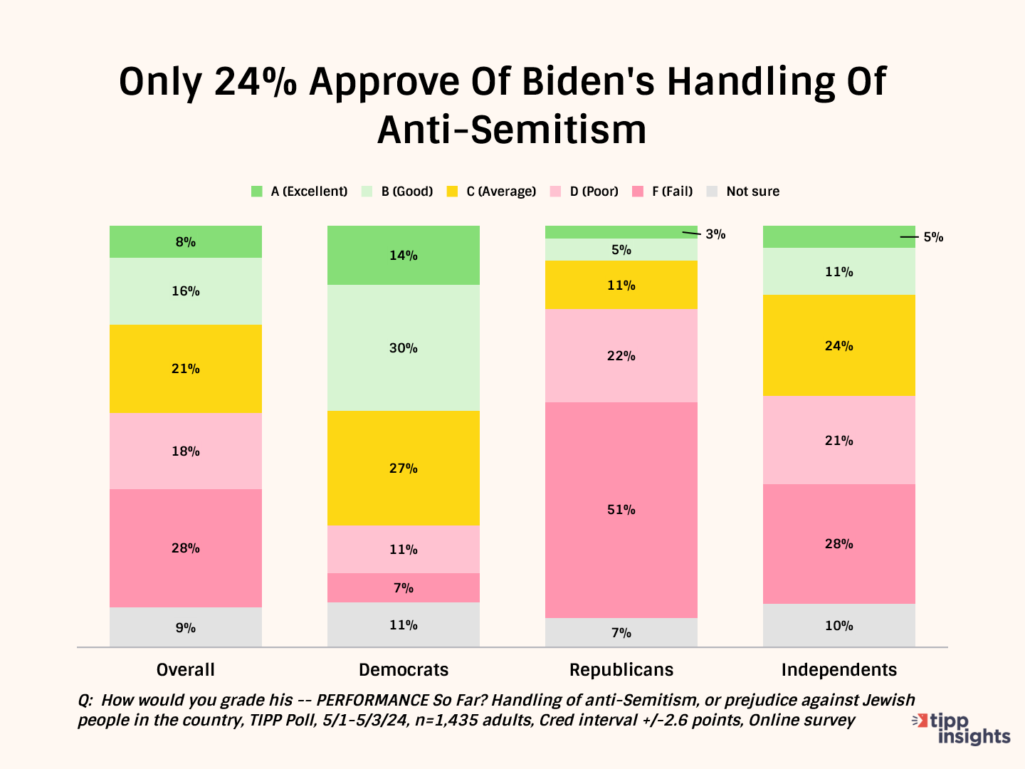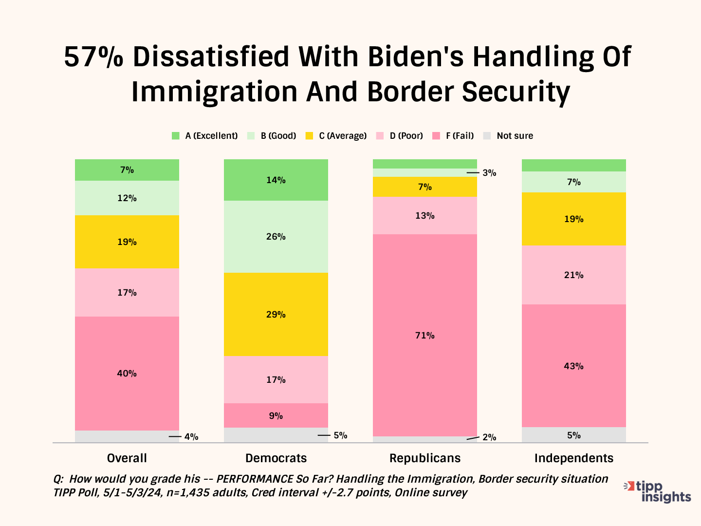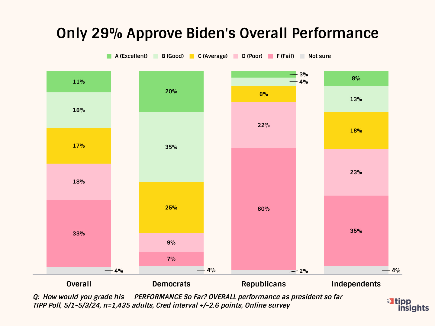 52% of Democrats give him good grades. Meanwhile, most Republicans (81%) and independents (57%) give him failing grades.