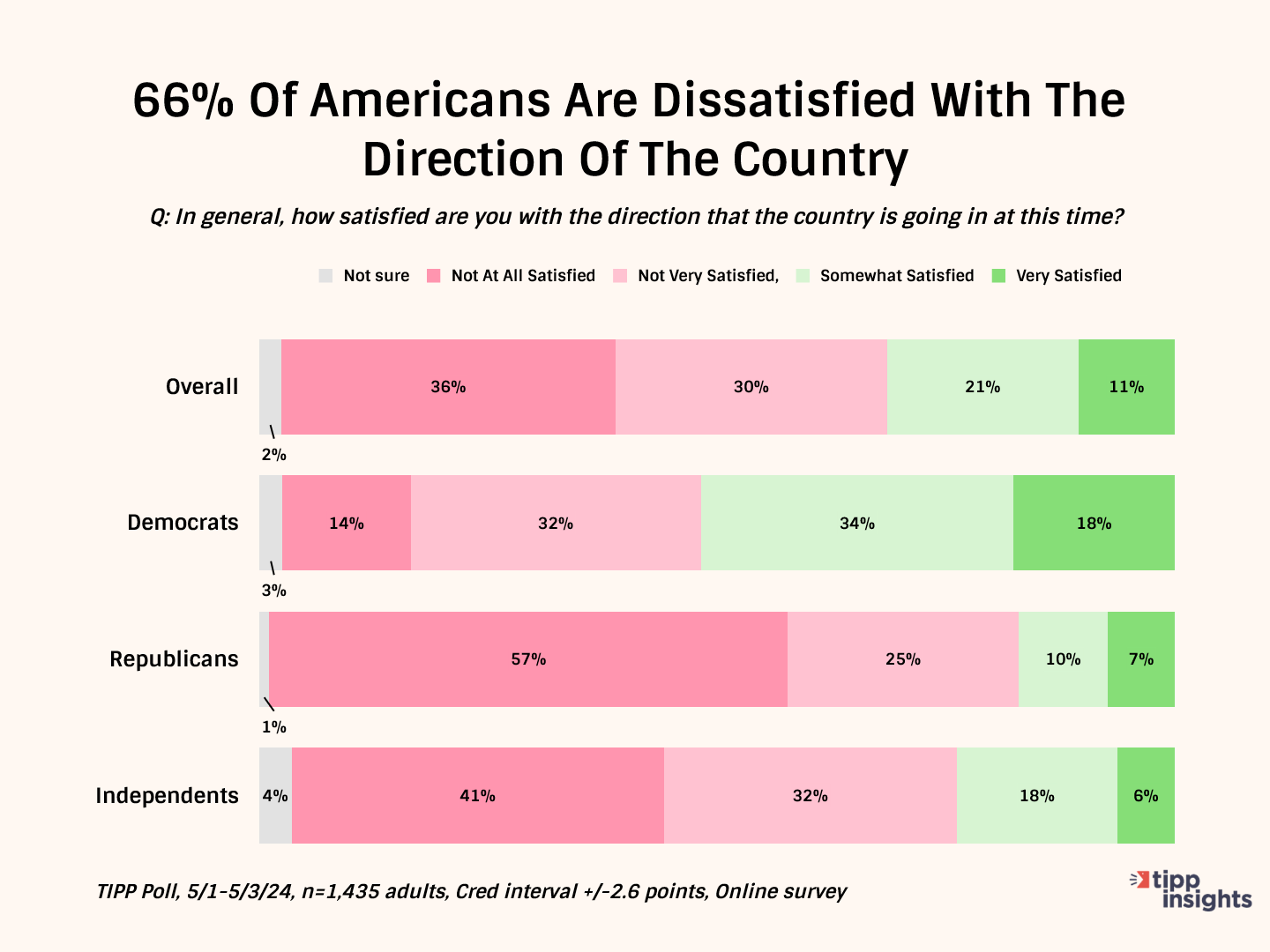 In summary, most Americans believe the nation is heading in the wrong direction under Biden's leadership. The survey reveals that two-thirds (66%) are dissatisfied, with 30% not very satisfied and another 36% not at all satisfied. Meanwhile, 11% are very satisfied with the country's direction, and an additional 21% are somewhat satisfied.