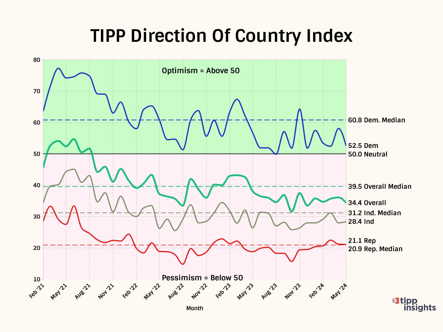 The overall Index has been in the pessimistic region since September 2021. In May, Democrats have the most optimistic reading at 52.5. Republicans have the lowest score (21.1), indicating extreme pessimism. Independents are in the middle at 28.4.