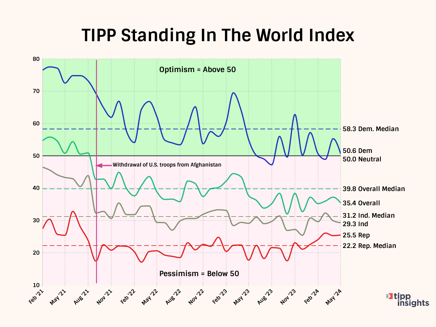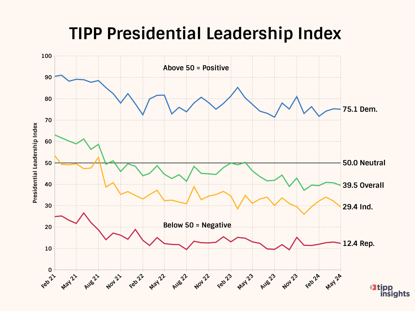 TIPP developed an innovative metric, the Presidential Leadership Index, to facilitate easy tracking of three components: favorability, job approval, and Presidential Leadership. The Index is calculated as the average of the three. Readings above 50.0 signify approval, while readings below 50.0 indicate disapproval.