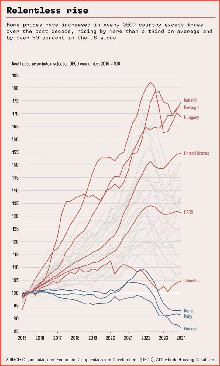 Over the past decade, real house prices have risen in nearly every OECD country, climbing by more than one-third on average and by over 50% in the United States. The sharpest gains came after 2020 and have not meaningfully reversed, suggesting housing has shifted from a cyclical market to a structural macro asset—driven by supply shortages, financialization, and demographic pressure rather than short-term booms.