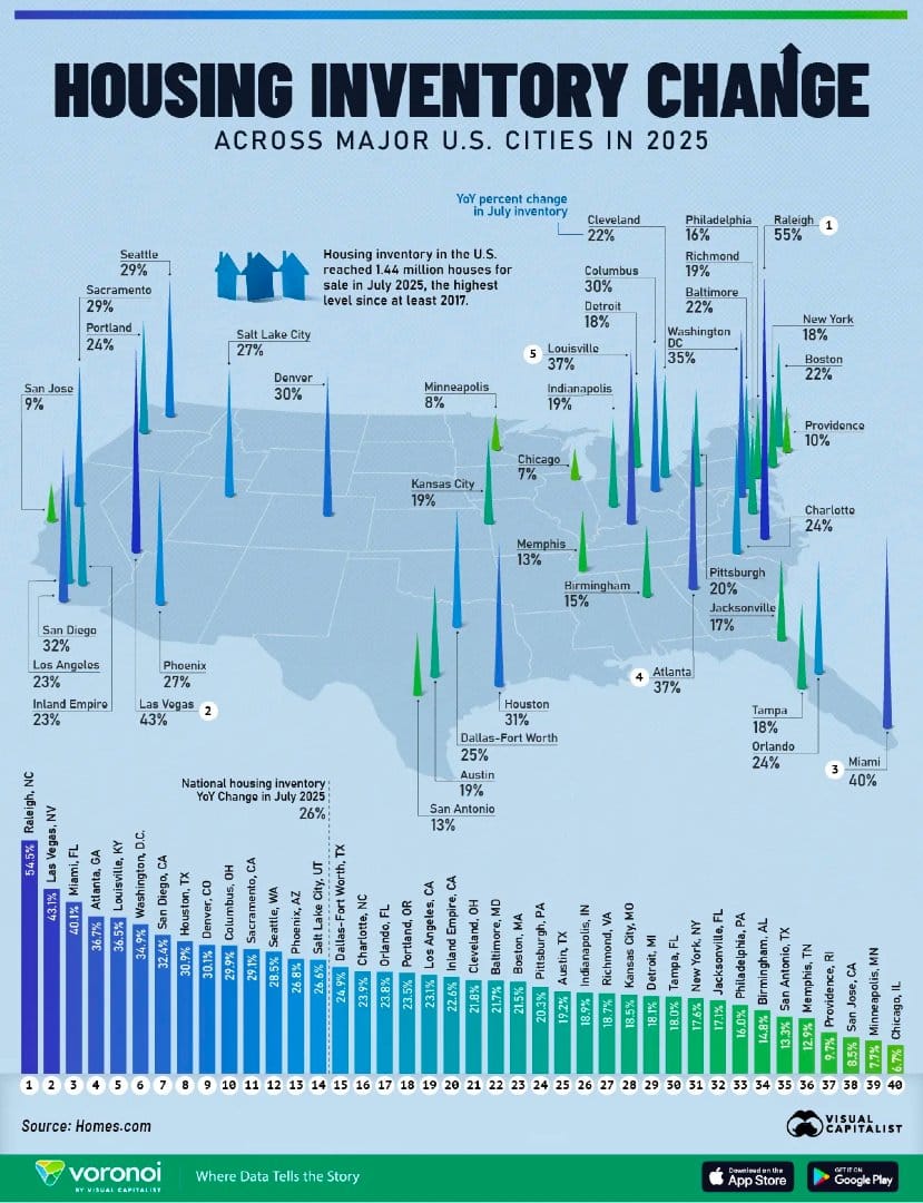 Housing inventory surged across most major U.S. metros in 2025, pushing the total number of homes for sale to 1.44 million, the highest level since at least 2017. Many cities saw double-digit year-over-year gains, signaling easing supply constraints even as affordability pressures persist—an early sign that the post-pandemic housing squeeze may be starting to loosen.