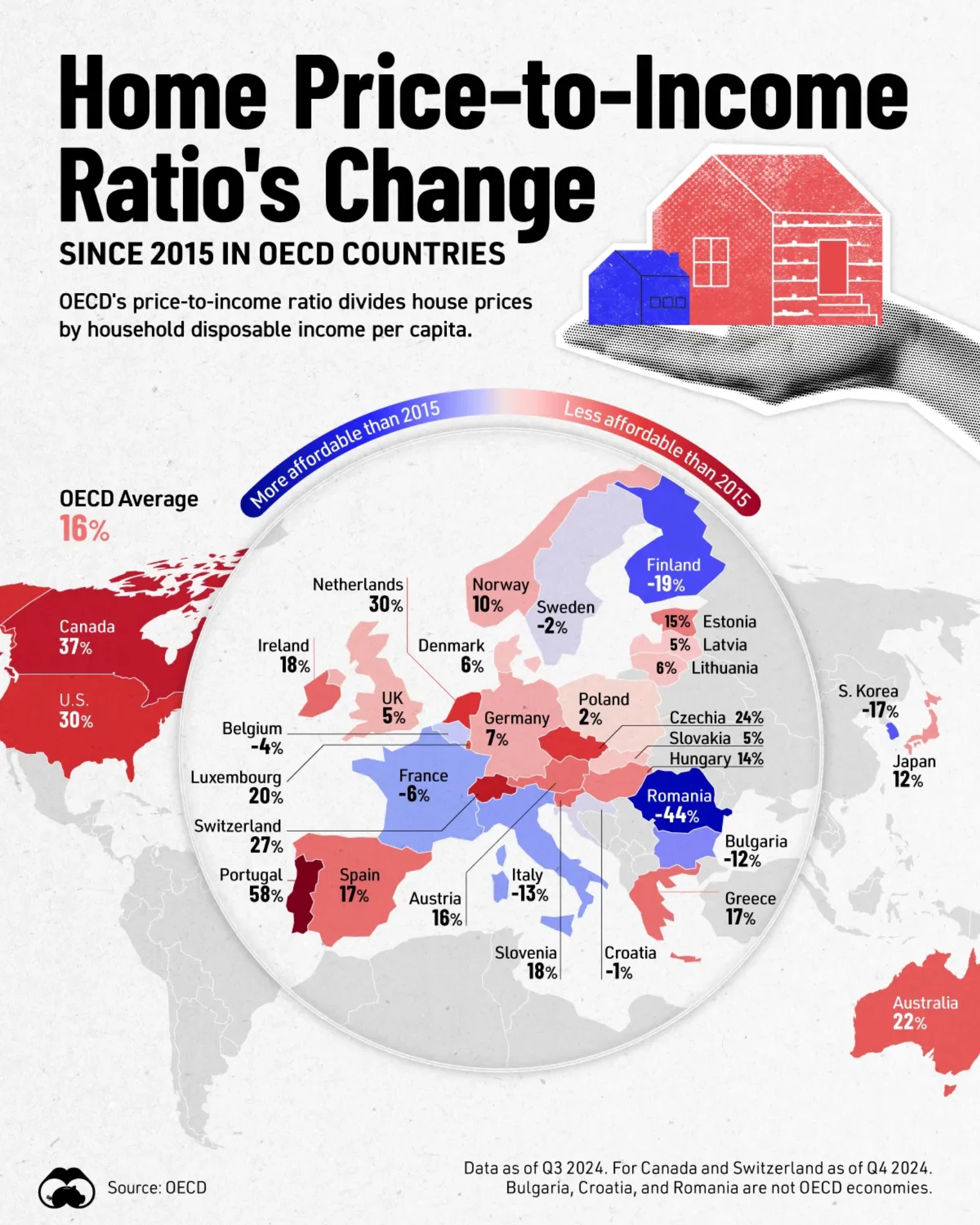 Since 2015, home prices across most OECD countries have risen much faster than incomes. On average, the price-to-income ratio is up 16%, with sharp deteriorations in countries like Canada, the U.S., Portugal, and Australia. Only a handful—such as Finland, Italy, and Romania—have seen affordability improve, making the global picture one of sustained pressure rather than a temporary housing cycle.