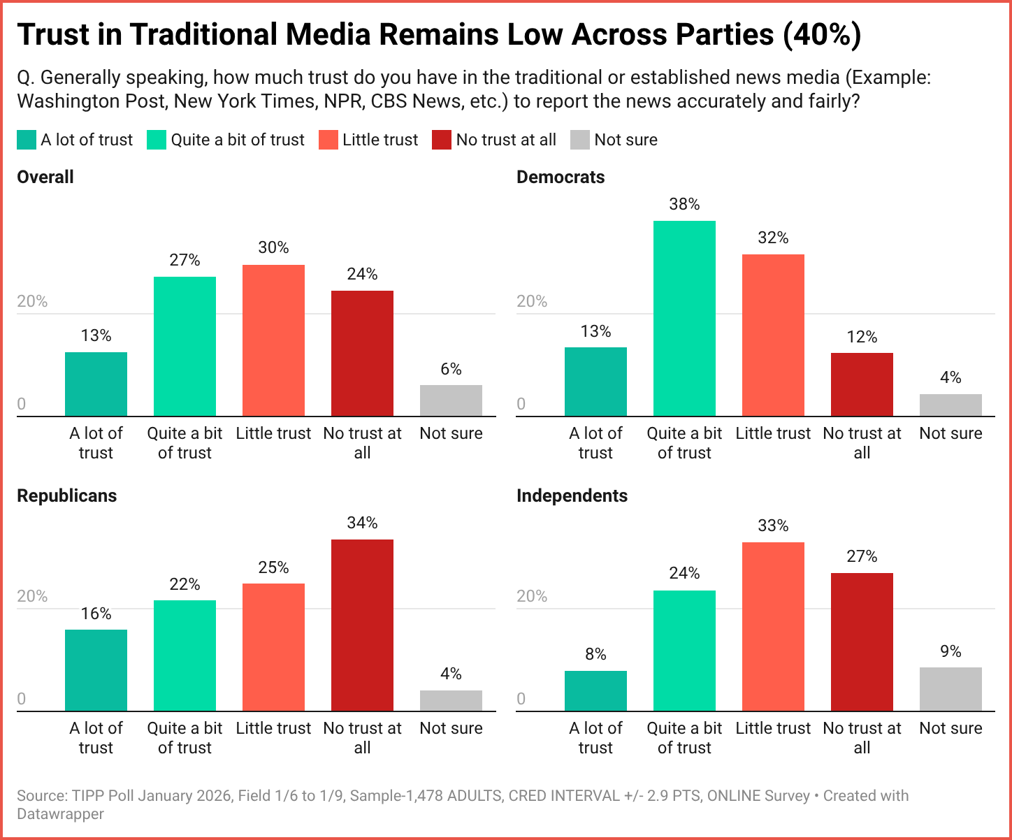 Omar didn't even get a scratch, and no one else was hurt, even mildly. Thomas Matthew Crooks intended to kill then-candidate Trump and would have succeeded had Trump not turned his head at that split second. Set side by side, the two incidents reveal a profound failure of proportion in modern political coverage. Public trust in traditional media now reflects that failure of proportion. Fewer than half of Americans express a great deal or quite a bit of trust.