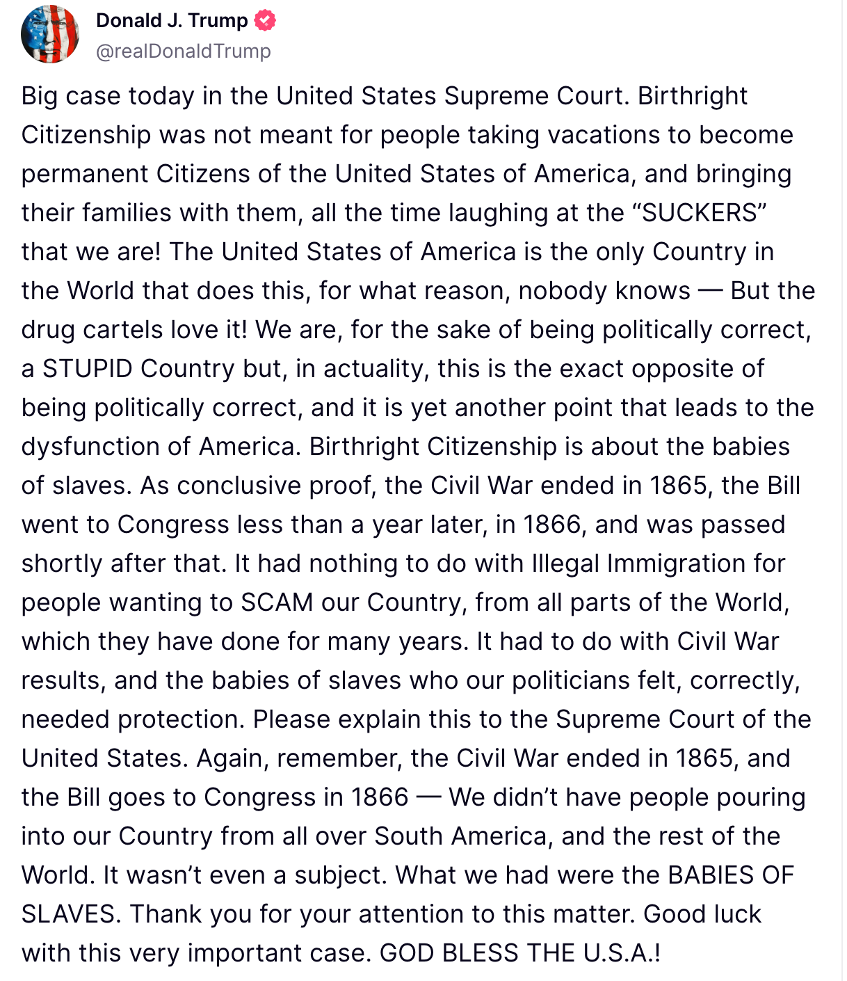 In a lengthy Truth Social post, Trump claimed the post-Civil War amendment was specifically designed to guarantee citizenship for the children of formerly enslaved people, not those seeking to “scam” the system through birth tourism or illegal entry. He pointed to the historical context of the amendment’s passage in 1866, saying mass immigration was not a relevant issue at the time.