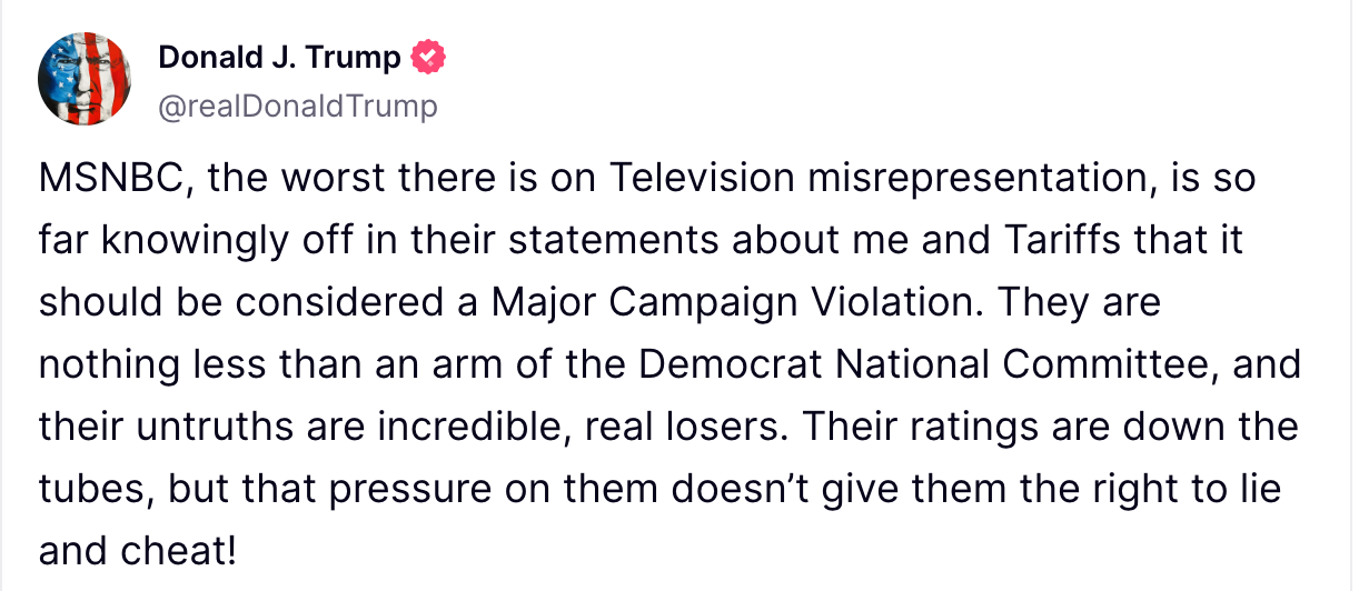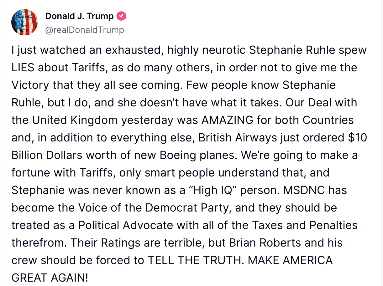 Trump used the opportunity to criticize MSNBC host Stephanie Ruhle, accusing her of lying about tariffs and calling her coverage part of a broader effort to deny him credit. He also attacked the network, referring to it as “MSDNC” and claiming it acts as a political tool for Democrats.