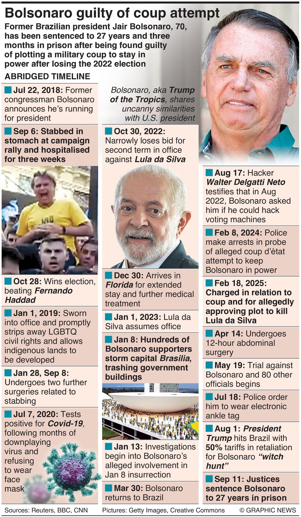 Former Brazilian president Jair Bolsonaro, 70, has been sentenced to 27 years and three months in prison after being found guilty of plotting a military coup to stay in power after losing the 2022 election.