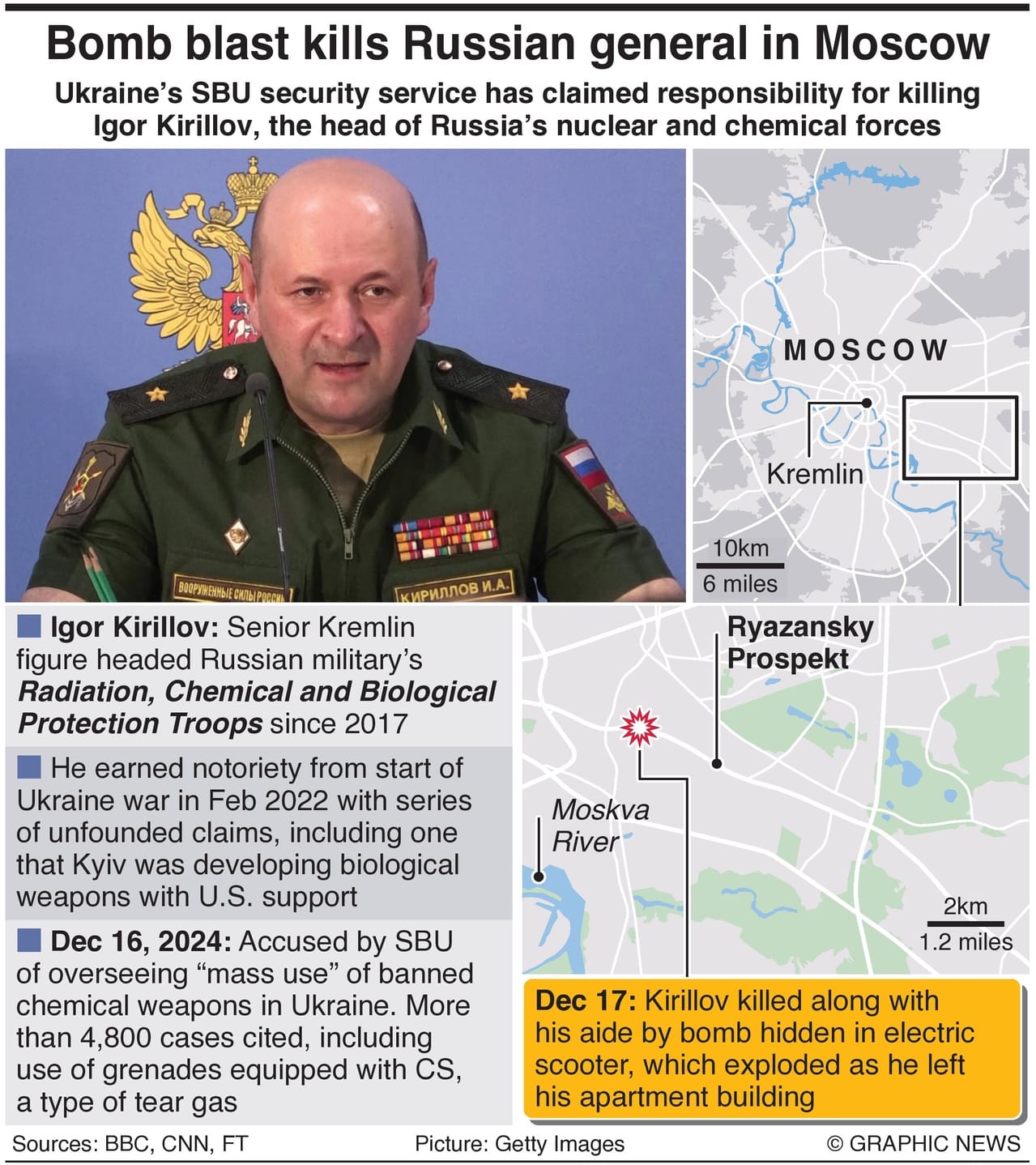 Kirillov and an aide were killed by explosives planted in an electric scooter, according to Russian officials, which was blown up as he left the building he lived in on Ryazansky Prospekt in south-eastern Moscow.