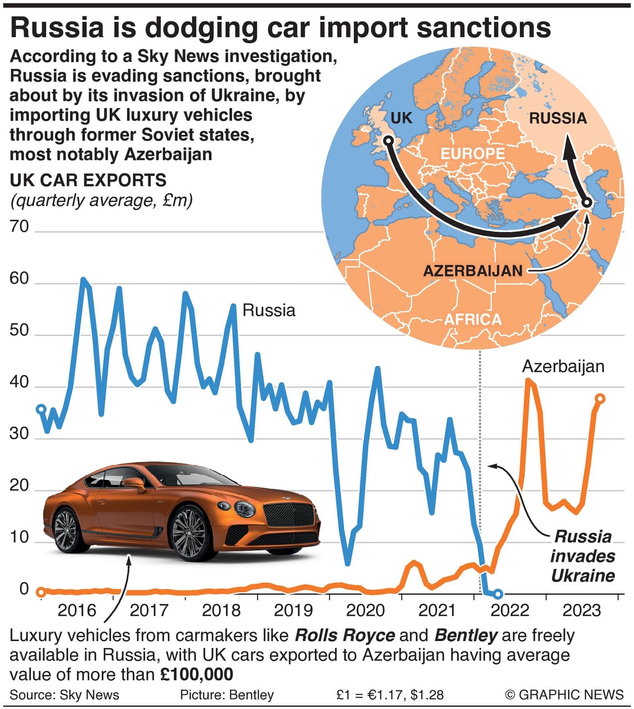 Direct exports from the UK to Russia ceased after the invasion of Ukraine in 2022. However, data from His Majesty’s Revenue & Customs (HMRC) shows that in 2023, the UK exported £273 million of vehicles to Azerbaijan—a huge increase on the years prior to the invasion.