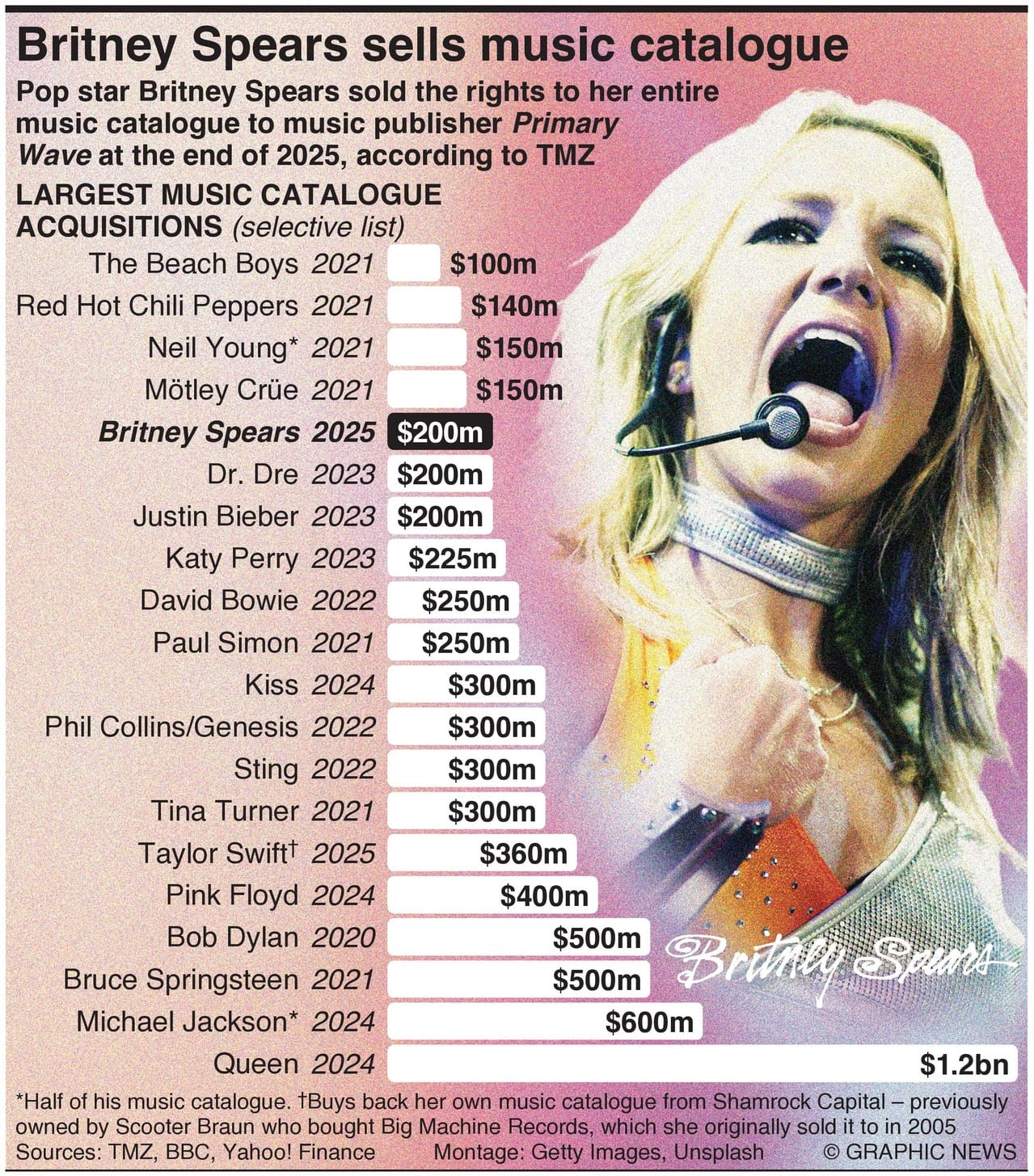 Pop superstar Britney Spears sold the rights to her entire music catalogue to independent music publisher Primary Wave for around $200m in late December 2025, according to showbiz website TMZ.