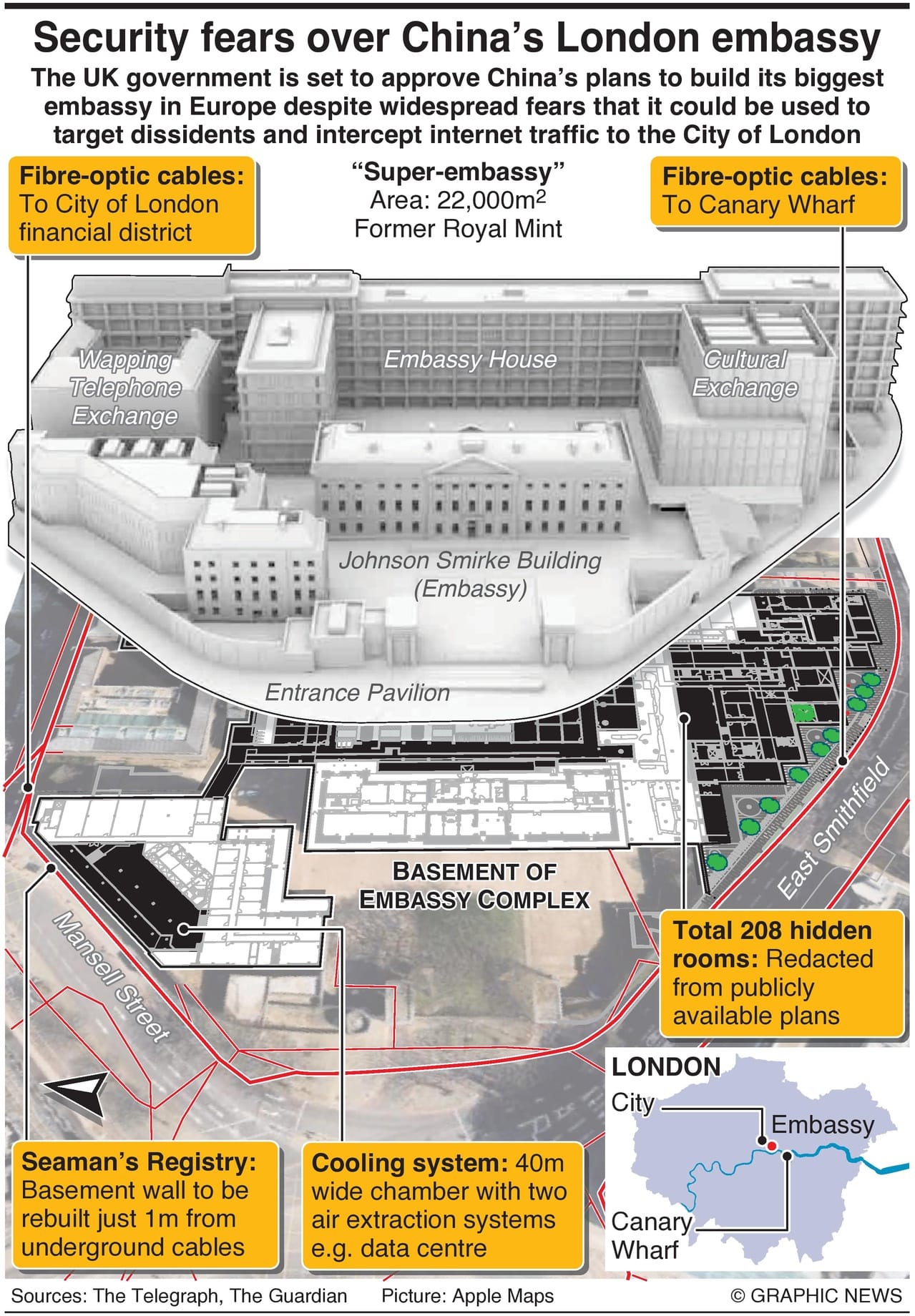 Local residents and rights groups have raised security, protest management, and heritage concerns, including about a subterranean “spy” facility. Beijing’s detailed specifications have not been made public, but The Telegraph obtained unredacted copies of the plans, which appear to show a large room with adequate cooling and ventilation for a data center to be built just one meter from fiber-optic cables serving the City of London and Canary Wharf financial centers.