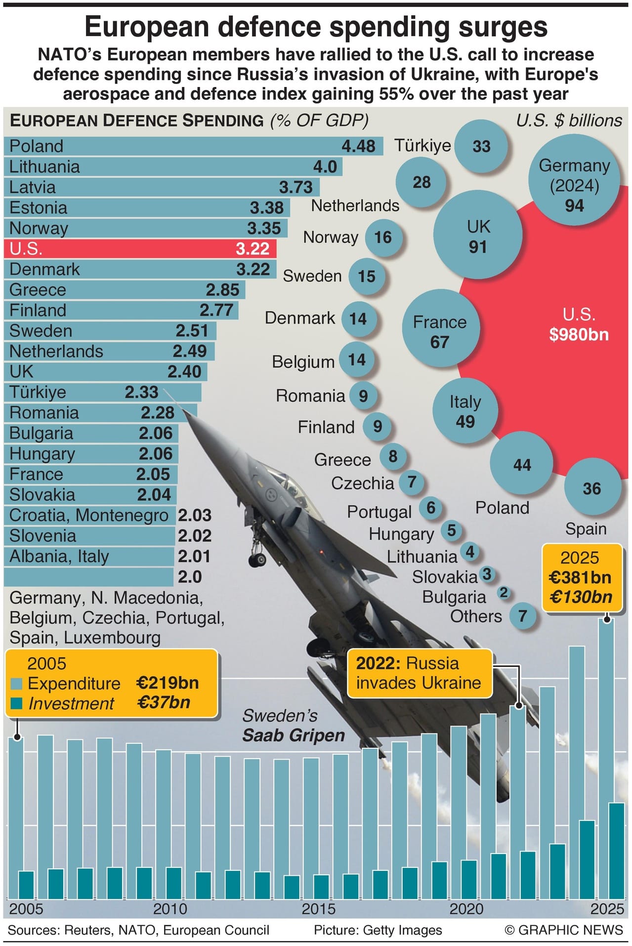 European defense spending for 2025 reached $381 billion, a surge of 62.8% since 2020, with defense investments rising by 150% to €130bn over the same period.