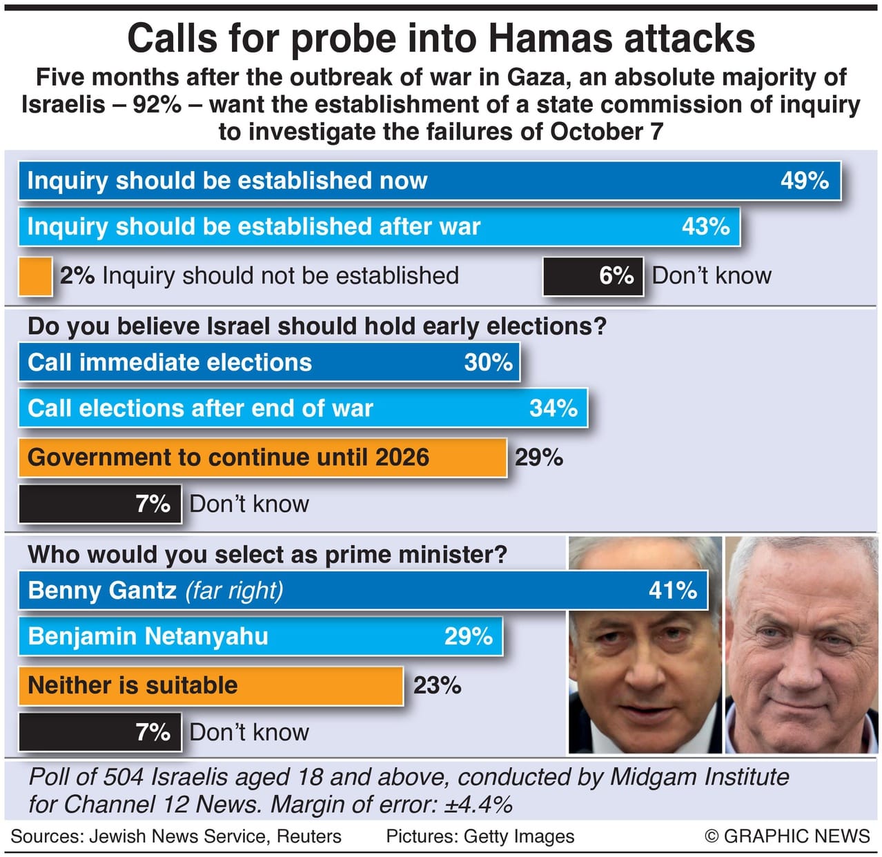 According to the poll published by Channel 12 on Tuesday evening, 49% of people said they believe Israel should immediately establish a state commission of inquiry into the events surrounding the October 7 massacre, while 43% called for an investigation after the war ended.