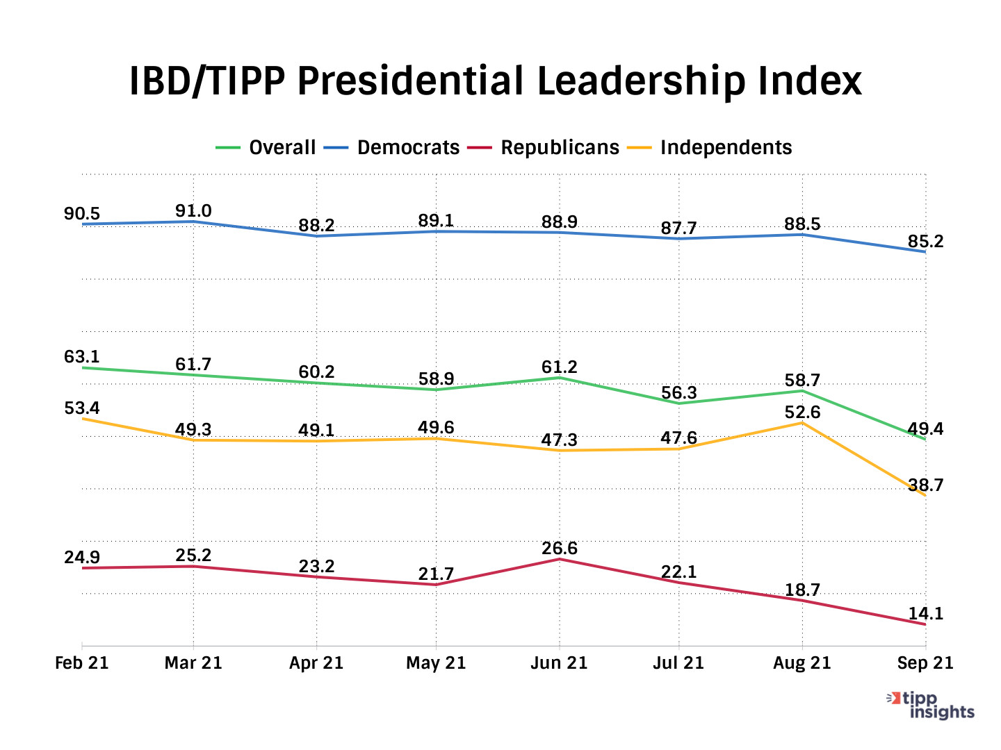 September was the biggest monthly decline in the IBD/TIPP Presidential Leadership Index's history, plunging 9.3 points, from 58.7 to 49.8, a 15.8 percent decline.