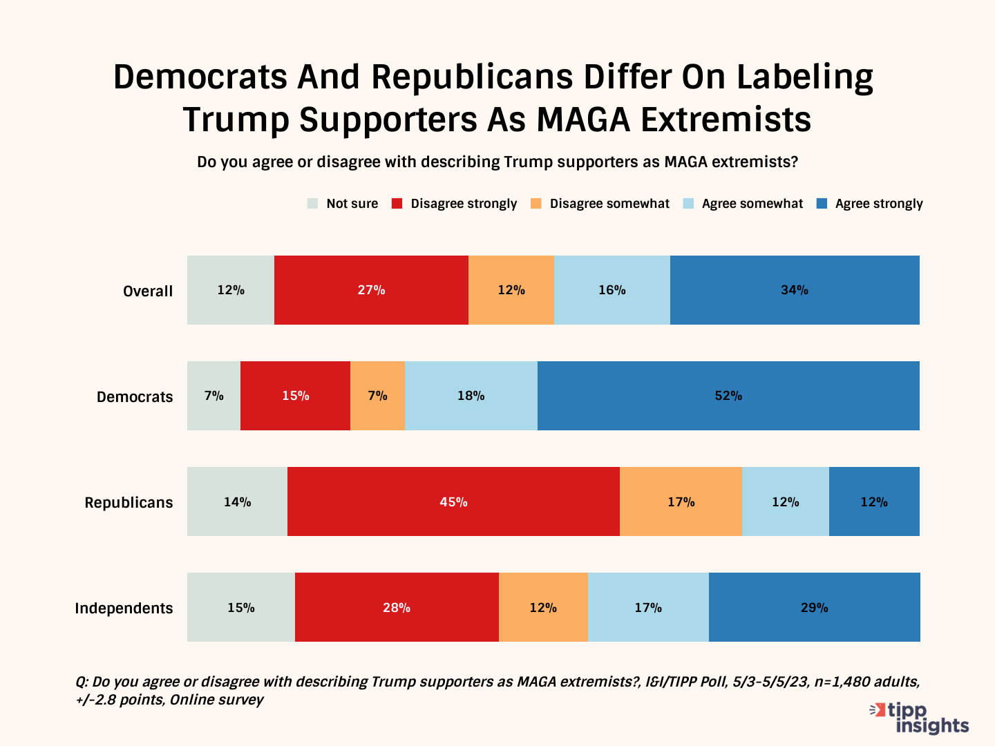In early May, we asked Americans the following question: "Do you agree or disagree with describing Trump supporters as MAGA extremists?" The online poll of 1,480 adults across the country was taken from May 3-5. The poll has a margin of error of +/-2.6 percentage points.