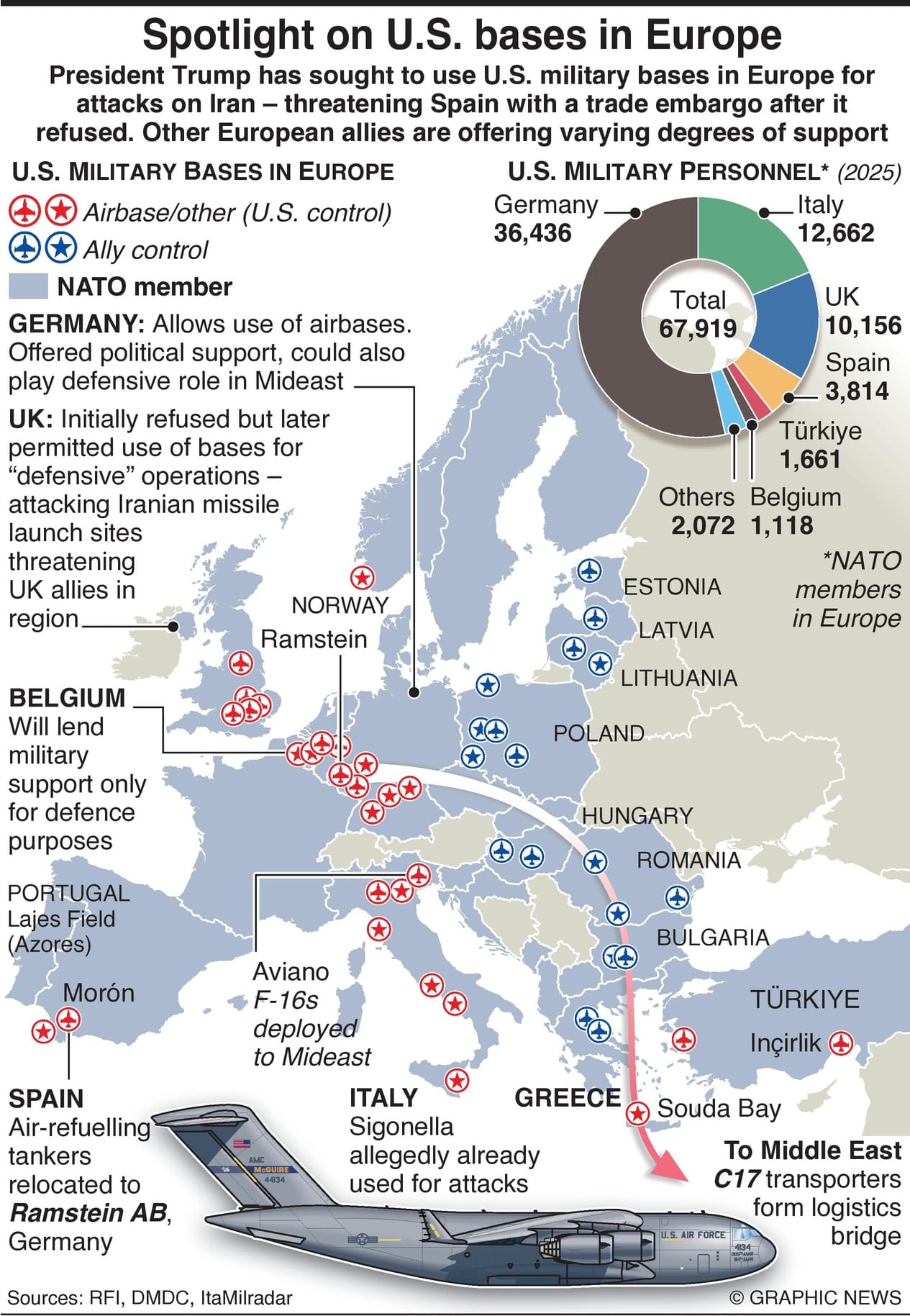 There are two U.S. bases and almost 4,000 military personnel based in Spain. Following the Spanish refusal, air-refueling tankers from Morón airbase were relocated to Ramstein AB in Germany, where the host nation has been more cooperative. Spain drew the ire of President Trump in 2025 when it refused to accept the NATO proposal for member states to increase their defense spending to 5% of GDP. However, as part of the EU, the U.S. cannot enforce trade embargoes on Spain without involving all member states.